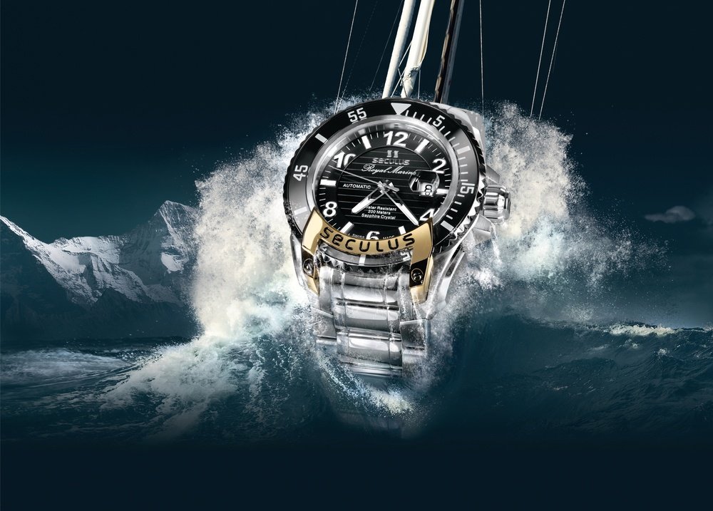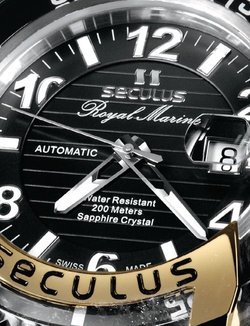 Resolutely sporty, daring and powerful with its water resistance to 200 metres, the Royal Marine by Seculus defies oceans and their depths. The 316L stainless steel case houses an ETA 2824 automatic movement, a token of reliability. The result is 48 mm of pure functionality: a three-hand dial and a date window at 3 o’clock, highlighted by a magnifying lens built into the sapphire crystal. Loyal to the rigorous standards and high performance demanded by Swiss watchmaking, the Royal Marine watch is a tribute to devotees of technology and style. Two engraved plates with or without gold plating – one between the lower horns and the other on the left-hand side of the case – proclaim its kinship with the name of both the brand and the model. This finely crafted and virile timepiece is fitted with a sporty triple-link steel bracelet or a silicon strap with diving extension.