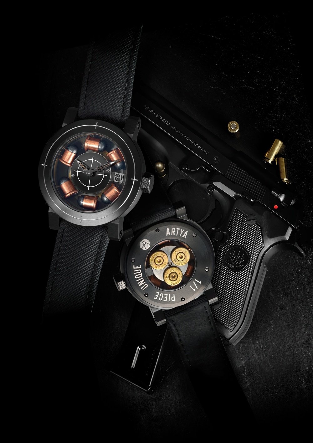 Bullets don’t always kill people, time always does. Such is the provocative statement on which Yvan Arpa has based his latest creation. Son of a Gun is an original match between watchmaking and the world of firearms. This world-first model houses six real 6 mm Flobert bullets suspended between the dial and case. The dial and bezel represent a target. Behind them, the oscillating weight of the Swiss automatic movement is ballasted by three special 38 mm bullet cartridges. A redoubtable horological “weapon” signed by the brilliant Yvan Arpa.