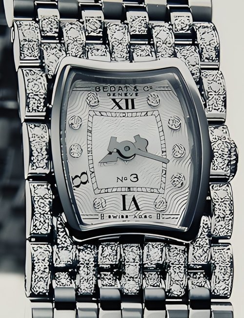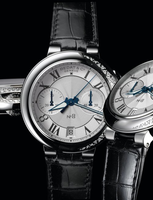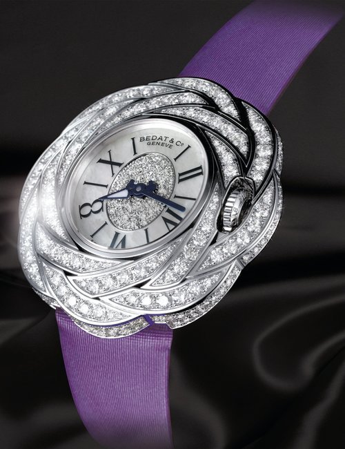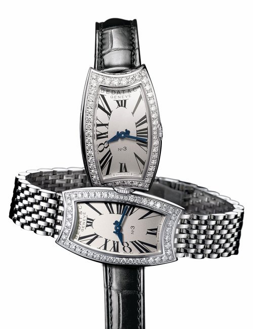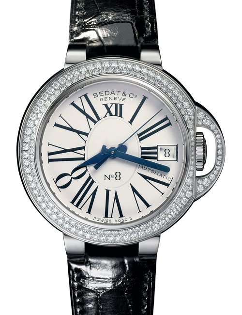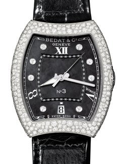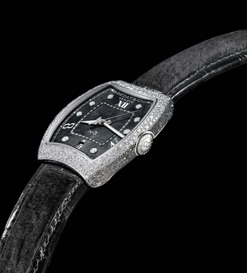 The no3 collection by Bedat & Co is enjoying a new lease on life and once again demonstrating the expertise of the Geneva-based watchmaker. This new reference 315, equipped with an automatic movement, is the epitome of femininity and elegance. 390 diamonds, sprinkled over the case like snowflakes, endow this exceptional model with impressive strength and character. The radiance of the stones is highlighted by the delicate snow-setting technique, perfectly framed by the tonneau-shaped case with its gentle yet firm lines. The black dial accentuates the charm of this model in which each detail lends an added touch of finesse: the 8 diamond hourmarkers, the stainless steel Roman numerals, as well as the “8” logo at 8 o’clock, the brand signature and lucky charm. This exquisite picture of refinement expresses noble, traditional jewellery-making skills and is adorned with almost 4 carats of gemstones.