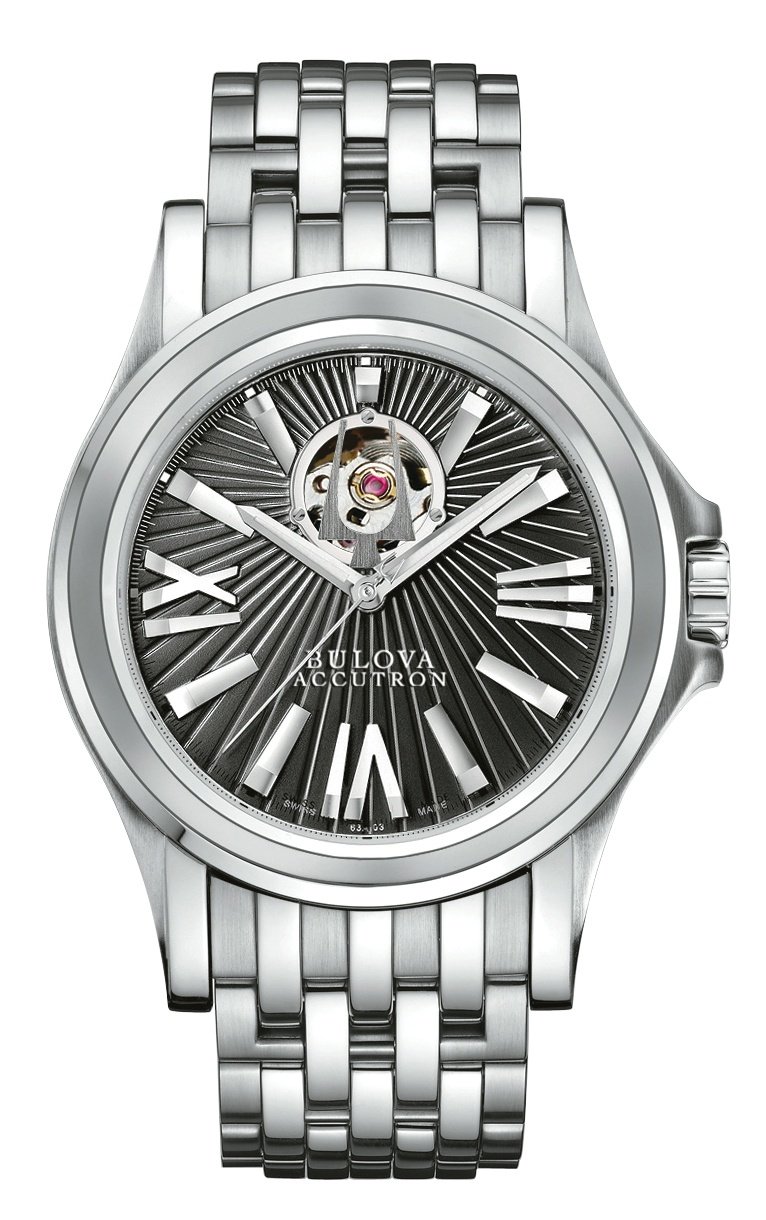 Bulova Accutron provides a bold take on contemporary watchmaking with this distinctive Kirkwood Collection model. Making automatic technology part of the architectural design, the case houses an automatic Sellita SW200 movement, visible through an on-dial aperture at 12 o’clock. The tuning-fork logo displayed over this opening becomes the starting point for the sunburst guilloché motif. With its strong lines and meticulous detail, this distinguished watch offers special appeal to devotees of innovative Swiss design.