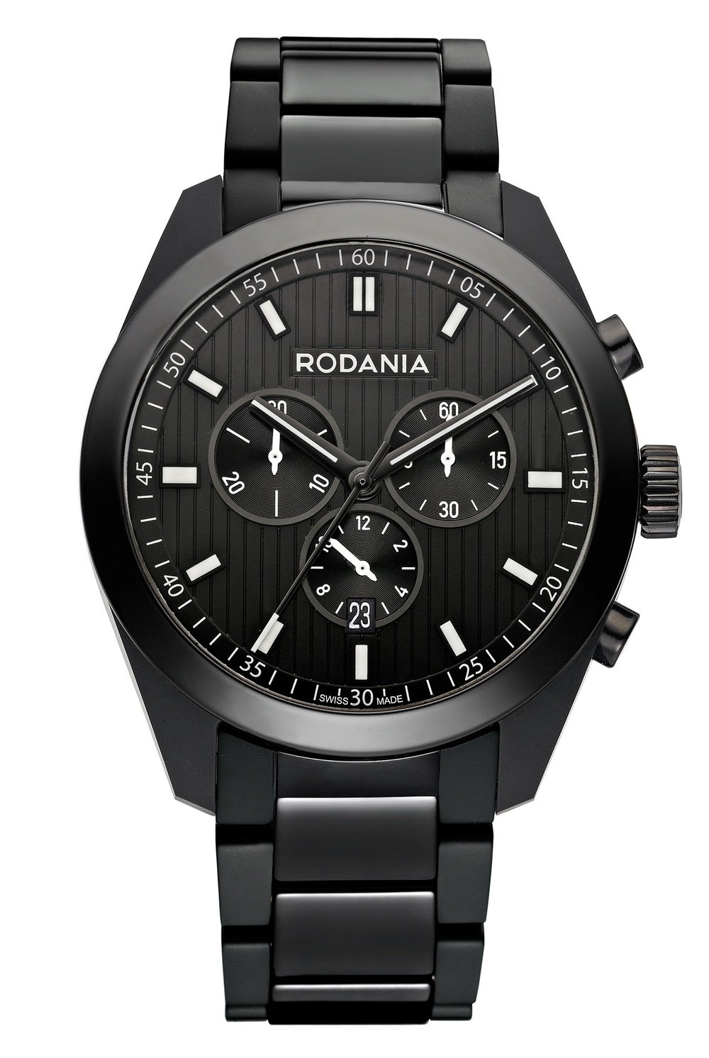 The remarkable blend of traditional and modern that guided Rodania in the design of the LS1 is evident at first glance. The ceramic case and bracelet links guarantee top performance from this rugged chronograph in all-over black. This hi-tech material accentuates the powerful line, sporting design, and provides a striking frame for the watchmaker’s expertise. The sandblasted and polished finish highlights the sheen of the case. A pure, uncompromising timepiece.