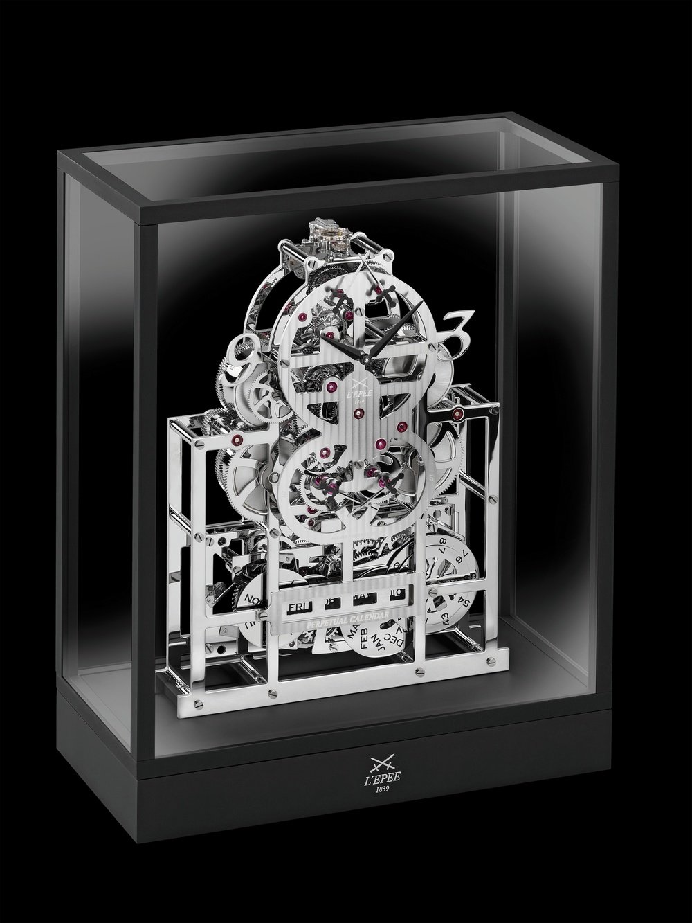 The two crossed swords are the signature and emblem of the L’Epée brand. This famous duel is now welcoming a noble perpetual calendar model. Three jumping discs at the lower end of the clock indicate the day, date, month and year. The power reserve corresponds as ever to the two swords which change angle according to the remaining level of autonomy. A second duel takes place at 12 o’clock and offers a fabulous spectacle of two swords following the rhythm of the seconds and clashing every 20 seconds. 12-piece limited edition.