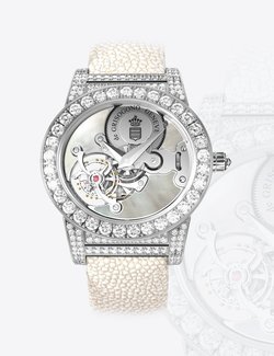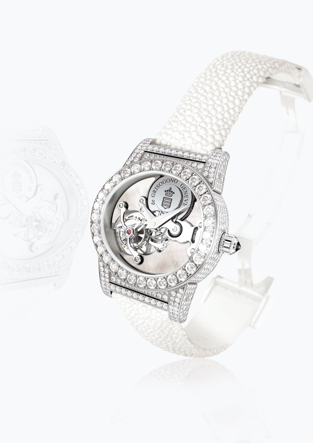 The brand’s latest creation, the Tondo Tourbillon Gioiello clothes in diamonds its new exclusive mechanical movement equipped with an offset tourbillon at 8 o’clock, reinterpreting this Grande Complication for the first time in a model dedicated to women. Available in white gold and distinguished by its oval shape, the Tondo XL case sparkles with the over 5 carats of white diamonds, running from the case sides over the horns and bracelet attachments. 33 larger-sized diamonds rim the bezel, giving it a dazzling glow. Its daring architecture and its exclusive calibre once again embody the creative vivacity of de Grisogono. A gem of Fine Watchmaking, the Tondo Tourbillon Gioiello offers a refined association between the precious jewellery spirit and highly sophisticated technical watchmaking.