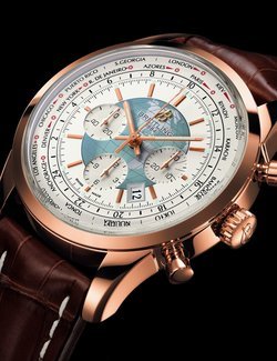 Breitling reasserts its watchmaking mastery with a new in-house “universal time” chronograph movement entirely developed and produced in its own workshops. Thanks to its double disc, the Transocean Chronograph Unitime simultaneously and constantly indicates the time in all 24 time zones. To change time zone, simply pulling out the crown and turning it in one-hour increments is enough to adjust in one smooth move the hour hand, city disc and the 24-hour disc, including the calendar. Moreover, none of these operations disturbs either the time or any timekeeping operations in progress. Featuring a blend of technical innovation and stylish aesthetics, this watch also offers a wealth of subtle details such as its dial with a globe motif and its red gold case. First-class travel on the wrist!