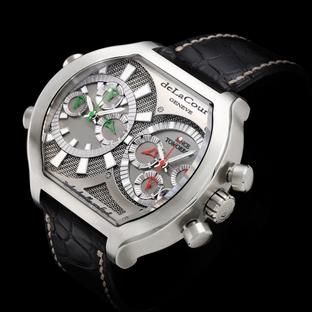 Pierre Koukjian is behind The Bichrono Tech, a new design that rivets the attention with its XXL tonneau case, an imposing 55 millimetres wide for a man who has nerves of steel. The two cleverly juxtaposed movements for a single dial make for intuitive reading of two time zones, two chronographs and the date. The dial’s twin levels accentuate the 3D effect. A steel mesh covers the back of the dial while two cutaway polished steel plates mirror the contours of the counters. Two pushers and a crown naturally take their place on each side of the case. A hi-tech, sporting, dynamic and contemporary design for men who aren’t afraid to speak their mind.
