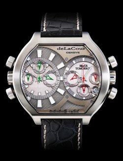 Hours, minutes, seconds, date, second time zone and second chronograph