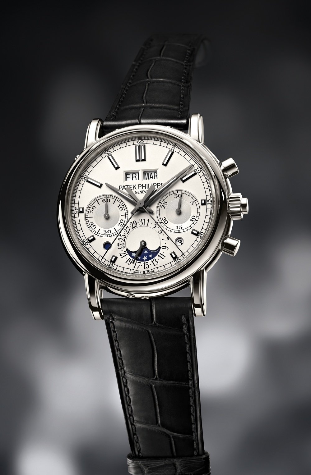 Patek Philippe has never departed from the refinement and exacting standards for which it is renowned, and this Haute Horlogerie complication timepiece – Ref 5204 – with split-seconds chronograph and perpetual calendar is the proof. It completes the traditional trilogy of Patek Philippe chronographs with proprietary movements, in this instance the hand-wound CHR 29-535 PS Q calibre whose split-seconds mechanism, a masterpiece of technical innovation and beauty, presents numerous patented inventions. The silver-toned opalescent dial, with three auxiliary counters and 11 indications, is a lesson in clarity and legibility. An extraordinarily elegant timepiece with a platinum case and matt black alligator strap, in the finest tradition of Patek Philippe.