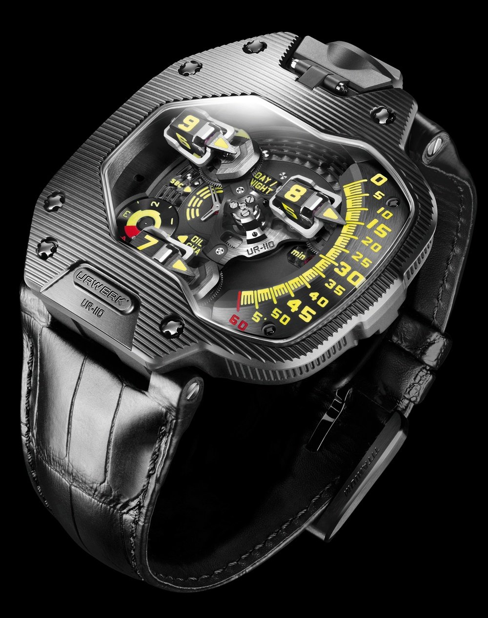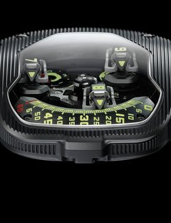 Already distinguished at the 2011 Geneva Watchmaking Grand Prix, the UR-110 is back centre-stage, still with its satellite hours on planetary gears connecting to a day/night indicator and oil change indicator. On the UR-110, hours face minutes along the right section of the dial, where a pointer descends a vertical scale, graduated from 0 to 60. Such a feat is made possible by the watch’s architecture on three levels of complexity. A central axis runs the full height of the watch to ensure the stability and balance of the entire mechanism; planetary gears govern the parallel rotation of the three hour satellites as they orbit the dial; three counter-rotating hour modules, each comprising an hour satellite and a minute hand, are individually mounted on a planetary gear. The result is an ingenious piece of avant-garde horology that displays the time with elegance and discretion.