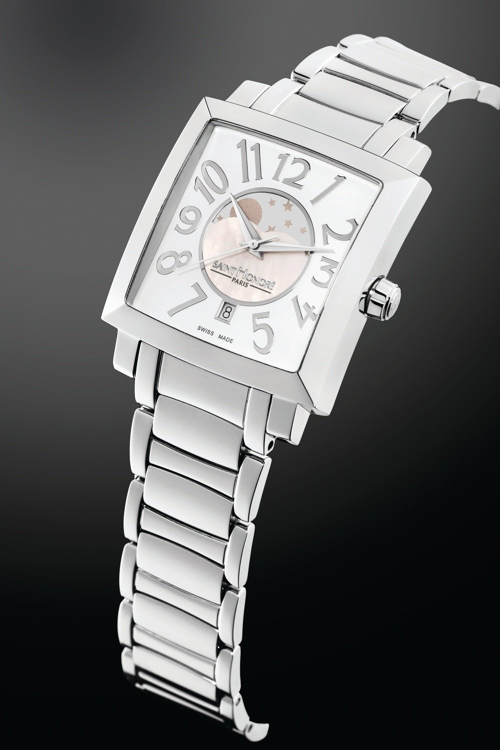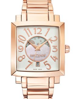A touch of glamour, a hint of Art Deco, a dose of cool composure: this timepiece has it all!. Chic and contemporary, its unique radiance comes from the iridescent shimmer of the mother-of-pearl in the centre of the dial and the lively sparkle of its twelve Arabic numerals, which illuminate the superb moon phase in the middle of the top half of the dial. The moon phase is shown on a delicately-wrought disc with a striking chiaroscuro effect. In immaculate white or deep brown, the contrast between the colours and the materials of the dials unify the different features and create an overall impression of harmony, elegance and seduction.