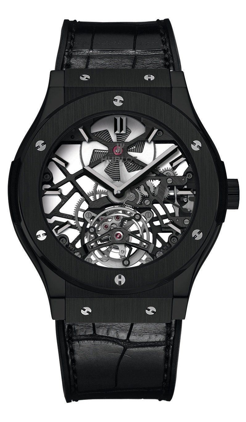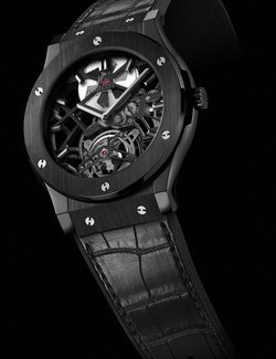 The latest new release from Hublot radiates a powerful visual presence. The Tourbillon Squelette Black Ceramic remains true to the brand’s identity codes, including a black monochrome design, while displaying a slimmer profile that gives it a more classic touch. But if there is one brand that knows how to combine tradition with the future, Hublot is definitely it! The openworked movement entirely designed, developed and produced by the Hublot watchmakers is resolutely graphic. The polished and satin-brushed black ceramic case radiates a sophisticated, contemporary appeal. And the most beautiful of all horological complications – the tourbillon – is revealed in all its splendour at 6 o’clock. In a nod to brand history, the hands echo the design of the very first Hublot watches, providing a fine demonstration of fusion between past and present, behind hand-crafted expertise and creative vision. 99-piece limited series.