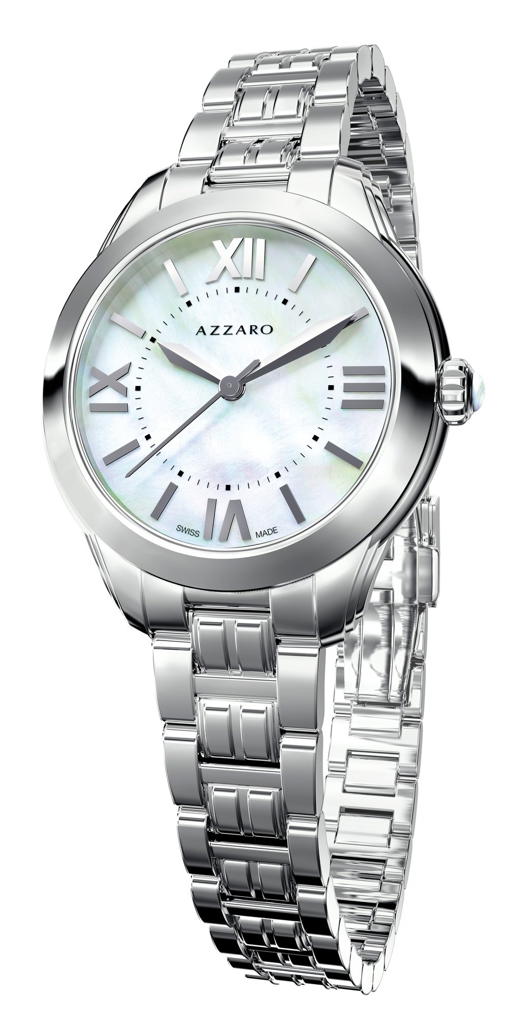 At once classic and contemporary, understated and refined, the latest watch creation from Azzaro combines the codes of Parisian elegance with Swiss horological craftsmanship. The simplicity of this three-hand watch guarantees perfect readability undisturbed by any additional displays. The applied hour-markers and Roman numerals reflect the nobility of steel and its polished texture. A glowing tribute to haute couture, the timepiece offers a perfect blend of the inherently seductive charm of Loris Azzaro, who believes that aesthetic boldness should be matched by technical precision.