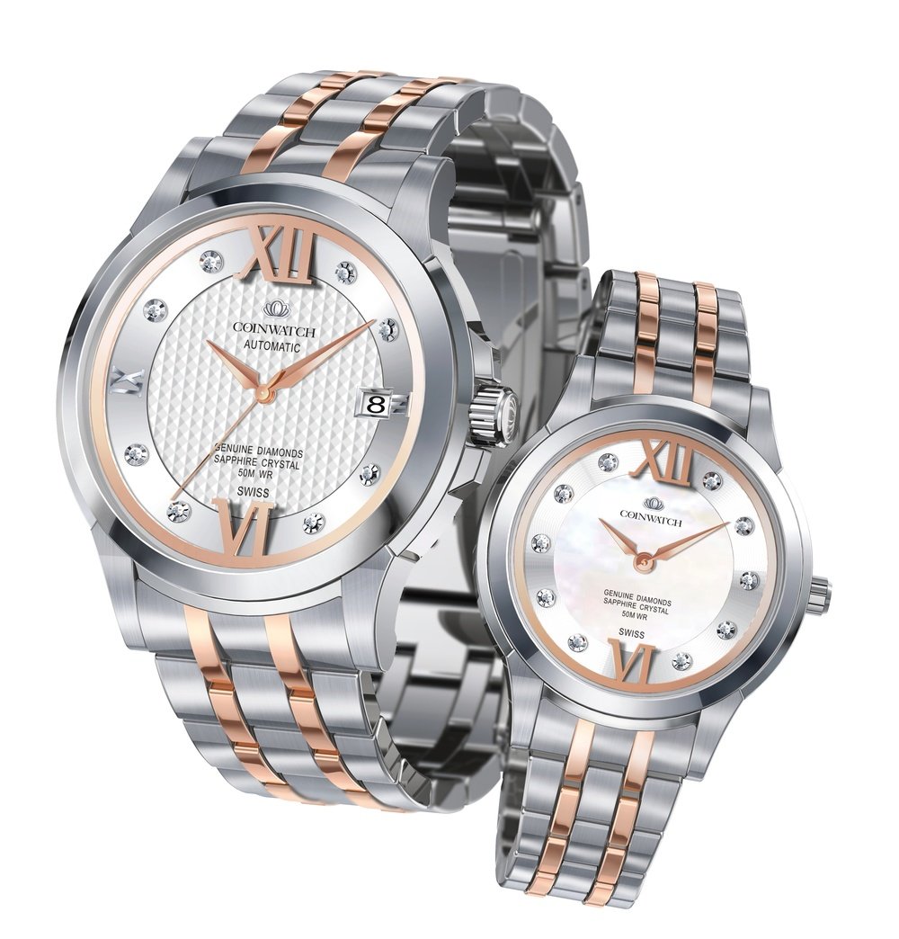Fresh from the success of its Mark Adore, Coinwatch presents a new duo of timepieces. Inspired by ancient coins, this watch comes as a 40 mm version for gents and a 30 mm version for ladies. Both sport a bracelet and case in steel matched with rose gold PVD coating. The difference is in the dial, with a guilloché motif for him and white mother-of-pearl for her. And while madam is treated to 10 diamond hour-markers, monsieur sparkles too with 8 diamond hour-markers and a date window.