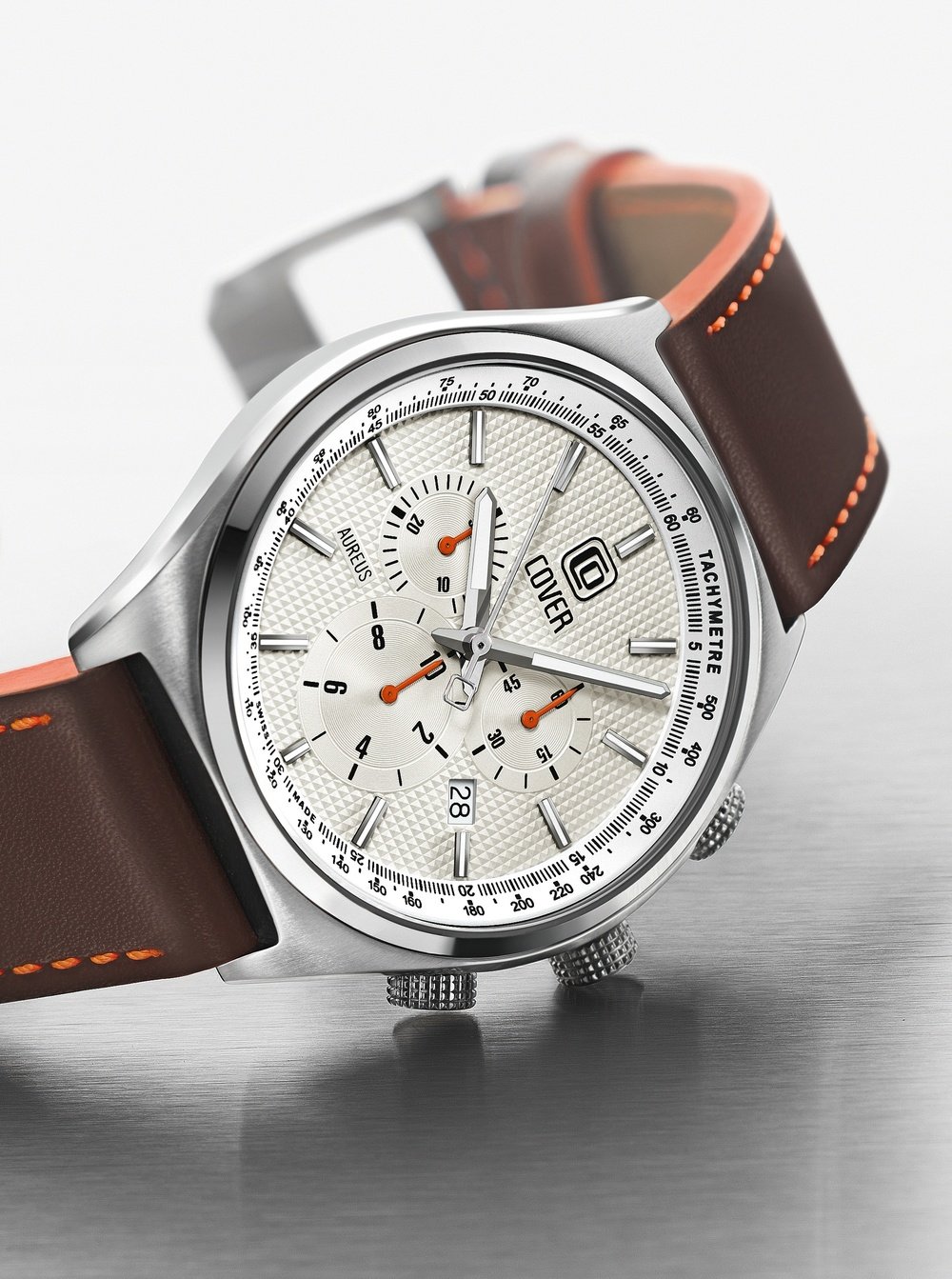 Classic but no less contemporary, Cover’s Co165 AUREUS Chronograph is all about contrast. Its pared-back design makes a strong masculine statement but isn’t afraid to choose a profiled white dial embellished with “Clous de Paris” guilloché. Tone-on-tone counters are the backdrop for the chronograph’s three red hands in their more or less frenetic race against time, from 1/10th of a second to 30 minutes. The tachymeter scale on the inner bezel ring will also keep energy levels high! Proposed in black, white, or in steel for a sports attitude.