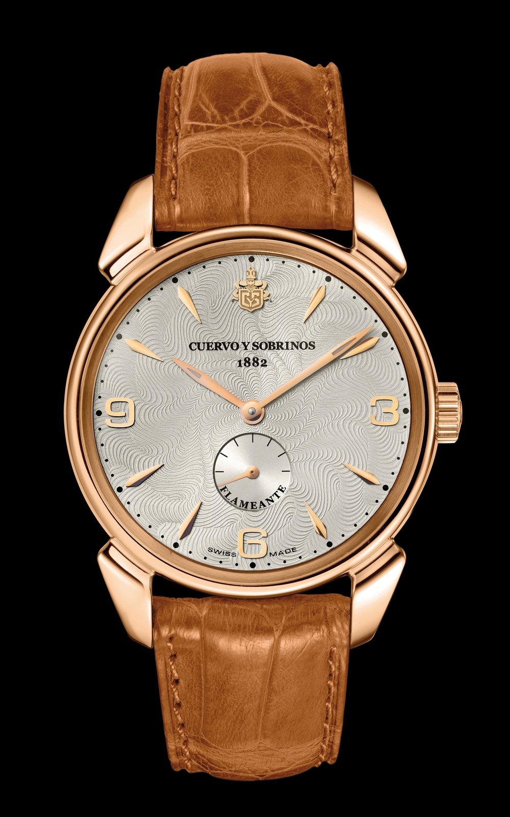 The Swiss brand with a Latin soul, Cuervo Y Sobrinos excels in bringing its history to life in its watches. Once again this year, the brand revives a landmark model from its past. The Historiador Flameante pays tribute to a 1950s watch. Flameante or flaming like the finely guilloché dial and movement finishes: the Côtes de Genève pattern on the plate, the blued screws, and the “Testimony of Style since 1882” inscription engraved around the movement, all visible through the sapphire crystal back. The hand-wound calibre, with small seconds offset at 6 o’clock, is housed inside a rose gold case whose 40 millimetre diameter is both classic and universally pleasing. Cuervo Y Sobrinos again transports its history into the 21st century and, today as yesterday, proves it is an accomplished advocate of refinement and elegance.