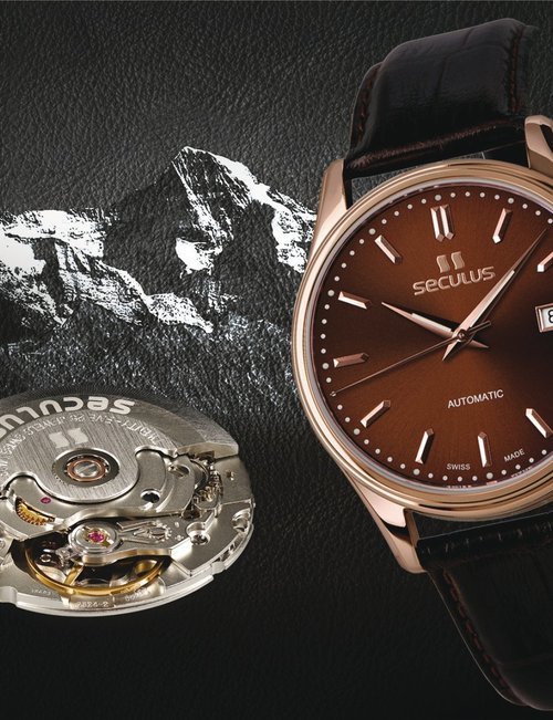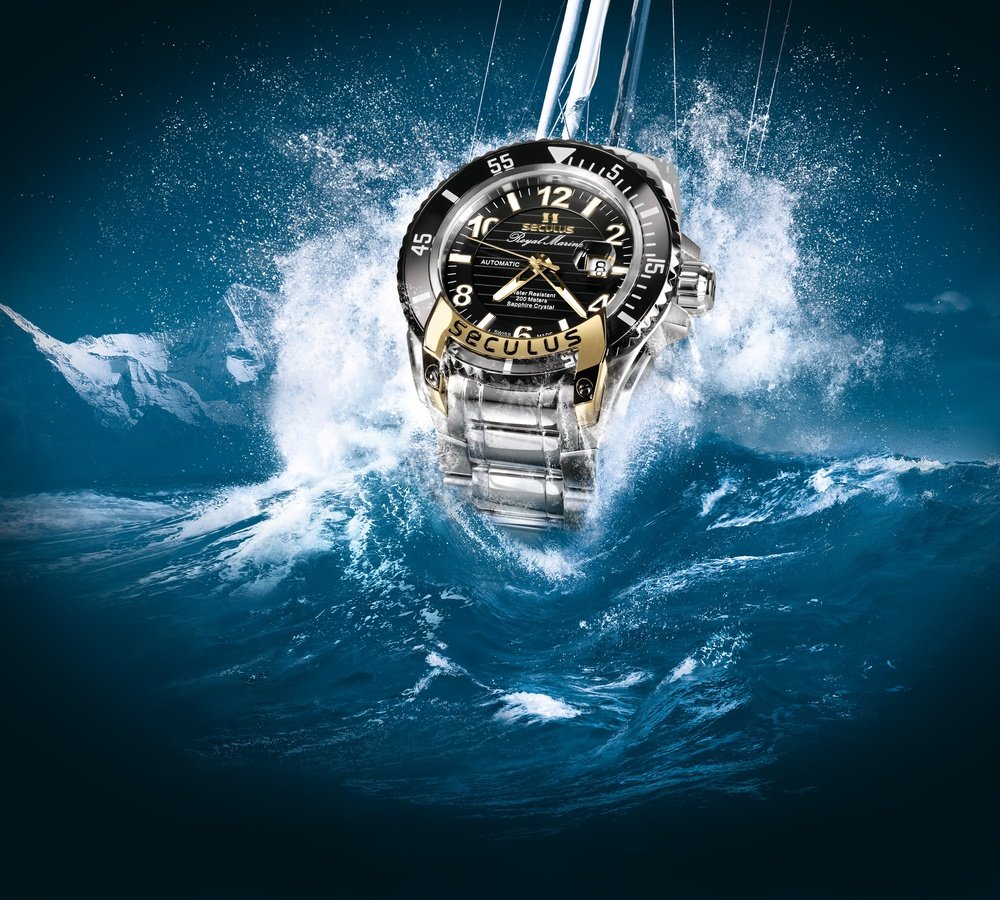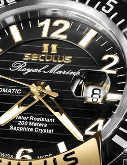 Resolutely sporty, daring and powerful with its water resistance to 200 metres, the Royal Marine by Seculus defies oceans and their depths. The 316L stainless steel case houses an ETA 2824 automatic movement, a token of reliability. The result is 48 mm of pure functionality: a three-hand dial and a date window at 3 o’clock, highlighted by a magnifying lens built into the sapphire crystal. Loyal to the rigorous standards and high performance demanded by Swiss watchmaking, the Royal Marine watch is a tribute to devotees of technology and style. Two engraved plates with or without gold plating – one between the lower horns and the other on the left-hand side of the case – proclaim its kinship with the name of both the brand and the model. This finely crafted and virile timepiece is fitted with a sporty triple-link steel bracelet or a silicon strap with diving extension.