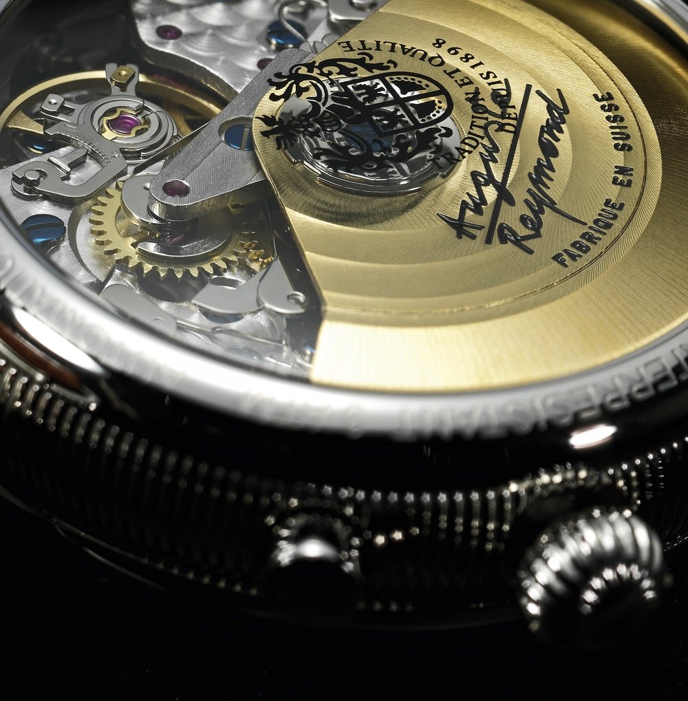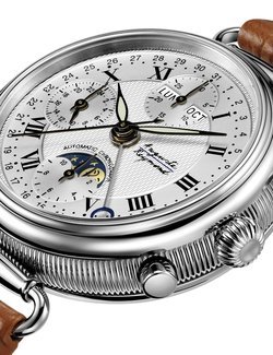 Back to the 1930s, halcyon days for Auguste Reymond when the company ranked among those known in the industry as the “watch barons”. This was also the golden age of jazz, and the moon phase a complication the company already mastered. Jazz Age Moonphase is thus a tribute on two counts, to the exciting jazz years and to the brand’s own golden era. The full calendar and chronograph indications are driven by the Valjoux 7751 calibre. The silver-toned guilloché dial assembles small seconds and 24-hour display at 9 o’clock, a 30-minute counter, day and month windows at 12 o’clock, and a 12-hour counter and moon phases at 6 o’clock. The mobile attachments add to the elegance of this original, deliciously vintage timepiece.