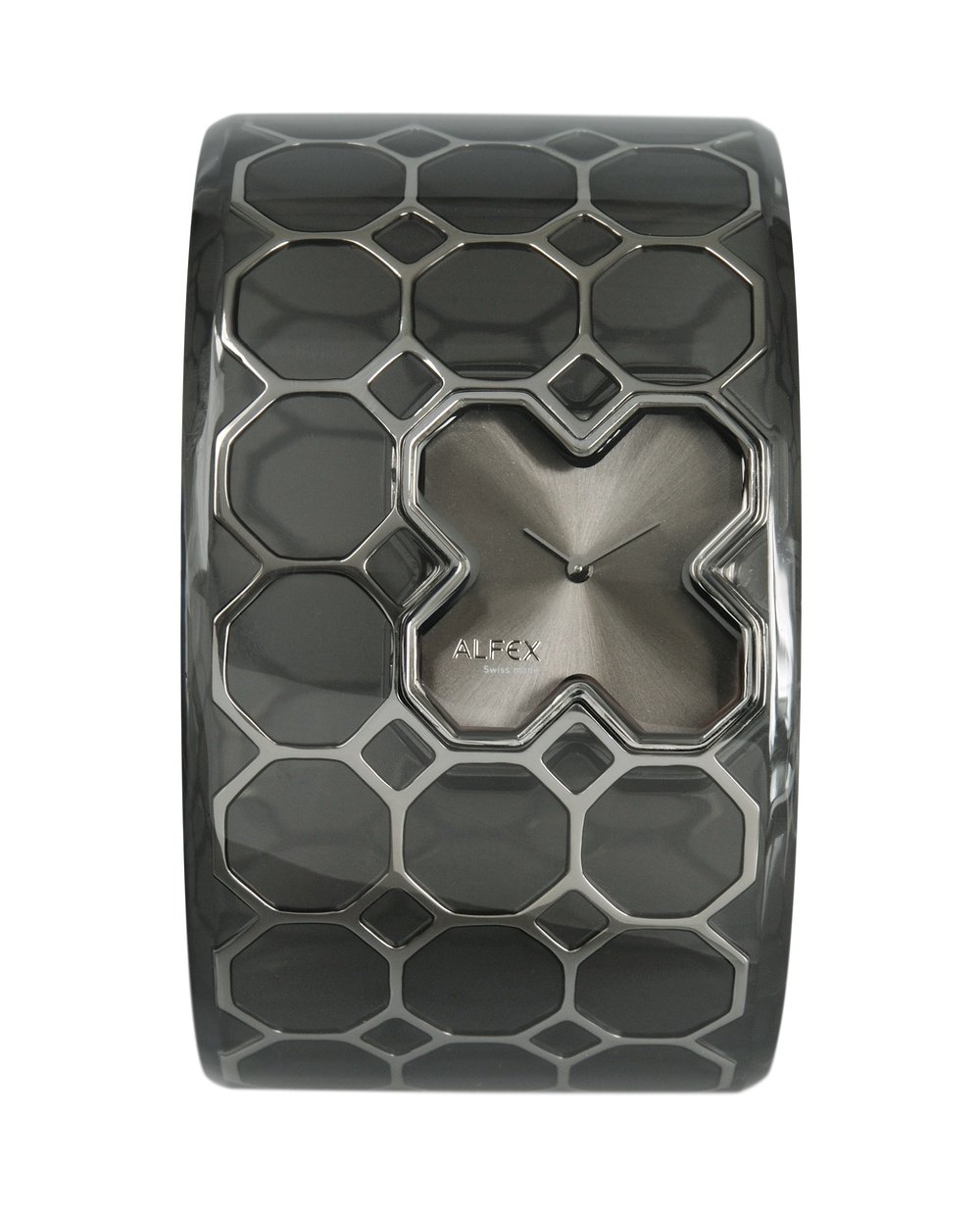 A watch, an accessory, a piece of jewellery: with its Translucent 8x, the Ticino-based Alfex brand explores uncharted territory. This contemporary and avant-garde watch innovates first and foremost in terms of its shape with a bangle-type textured acrylic strap, and secondly through its lines. An octagon duplicated all around the strongly curving bracelet creates a wire mesh pattern composing a sequence of “8” numbers echoing the mathematical symbol of infinity. The off-centred dial shakes up conventions by framing the outlines of four assembled octagons. This model showcases the technical and aesthetic talents of Alfex by achieving a perfect balance between materials: supple and transparent acrylic on the one hand, and sturdy steel on the other, all in harmonious shades of grey. Like all Alfex creations, Translucent 8x embodies the watchmaker’s commitment to producing resolutely future-oriented timepieces with high added value.