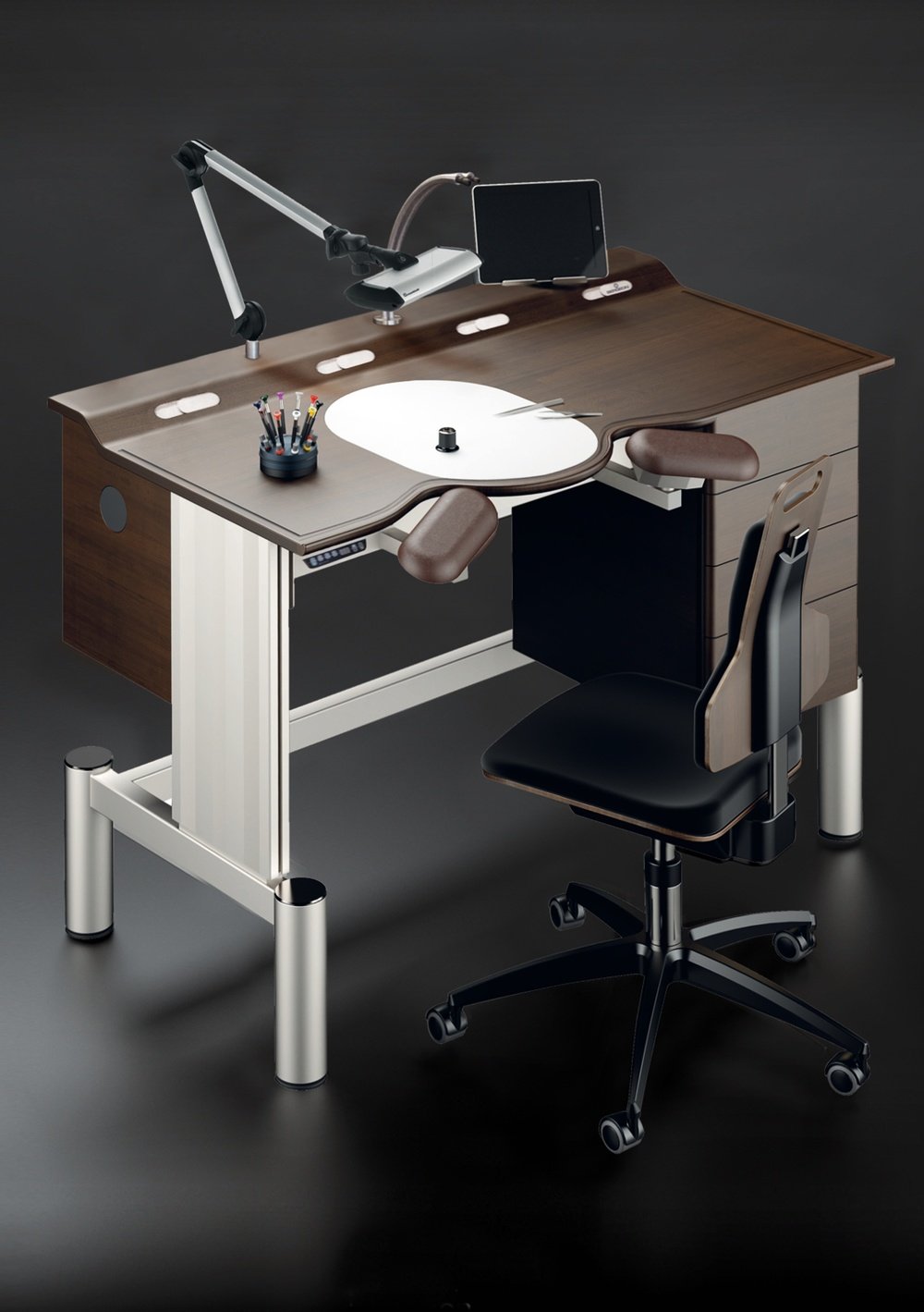 For BASELWORLD 2013, and as part of developments stemming from its R&D sector, Bergeon presents an ergonomic workbench with an all-new design. It places the watchmaker within his working environment while taking account of the functional and aesthetic demands inherent in his daily activity. A number of collaborative efforts undertaken with regard to the concept, the materials and the design have given rise to this workbench christened “DUNE” because of its split-level tray for which a patent has been filed.