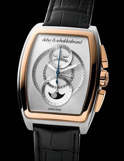 Dubey & Schaldenbrand addresses an audience of cognoscenti looking for exclusive creations; those which associate compelling designs with superlative mechanical movements. The brand’s favourite tonneau form has inspired many coveted models, including the Grand Dôme DT Rose Gold. The ingeniously proportioned case, true to the values of the ASTRO collection, makes no secret of its technical and aesthetic prowess. Dial and hands also testify to this distinctly contemporary impulse, along with the watch’s other attributes, not least the Valjoux 7751 chrono calibre and the brown alligator strap. Available in rose gold or a combination of rose gold and steel.
