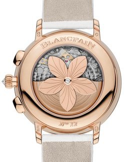 Established in 1735, Blancpain is the oldest watch manufacture in the world, renowned as much for its superlative watches, all created in-house, as for its calibres – 26 innovations over the past seven years. The new Chronographe Grande Date is no exception to this tradition. From the very first glance, the shimmering mother-of-pearl dial reveals two waves of 17 variously-sized diamonds rippling out from the centre. At 12 o’clock, the offset hour and minute display with Roman numerals on a mother-of-pearl dial creates a dynamic counterpoint to the Arabic numerals on the chronograph counters. Twin apertures at 6 o’clock frame the double-disc large date display. The red gold case with diamond-set bezel contains the Blancpain 26F8G calibre with its petal-shaped oscillating weight, visible through the sapphire crystal back.