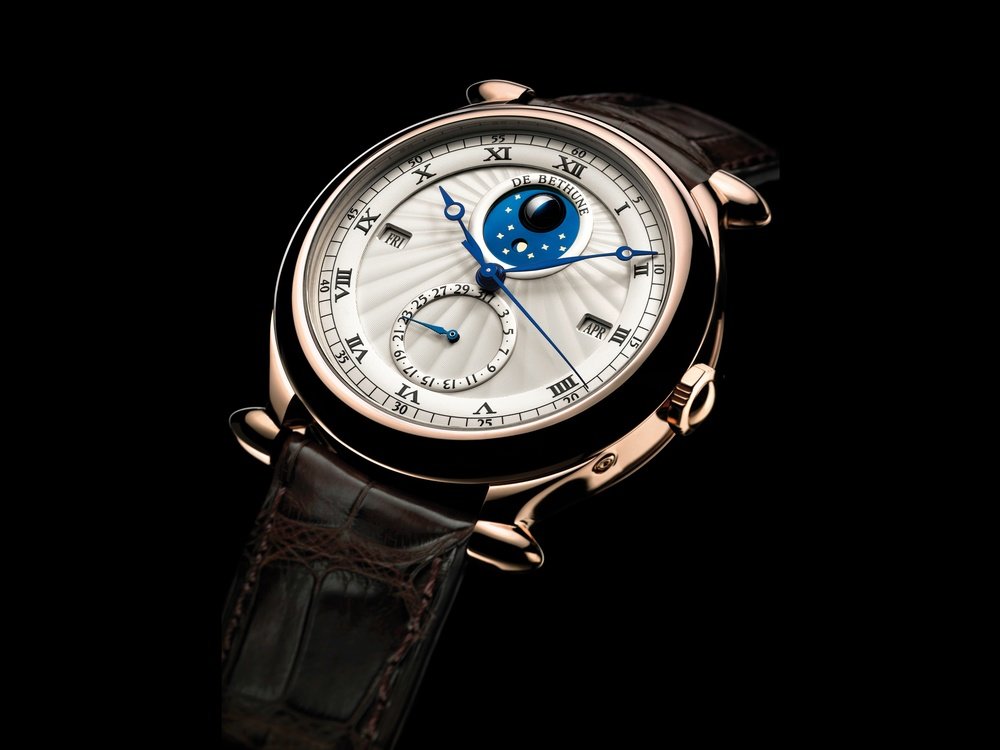 With the DB16, De Bethune celebrates classic Fine Watchmaking in a ballet of complications. The architecture of the DB2509 calibre is built around a silicon and titanium tourbillon beating at 36,000 vib/h, one of the fastest and lightest on the market. This movement also drives a power indicator, seconds, as well as a retrograde display of the age of the moon. Hidden on the back of the watch, this masterpiece will surprise connoisseurs looking for subtle details. The classically understated dial thus provides readings of the perpetual calendar and spherical moon-phase indications, sublimated by the Manufacture’s signature silver-toned guilloché motif. The steady, rhythmical beat of the jumping seconds embodies the very essence of the horological emotions procured by this stunning creation.