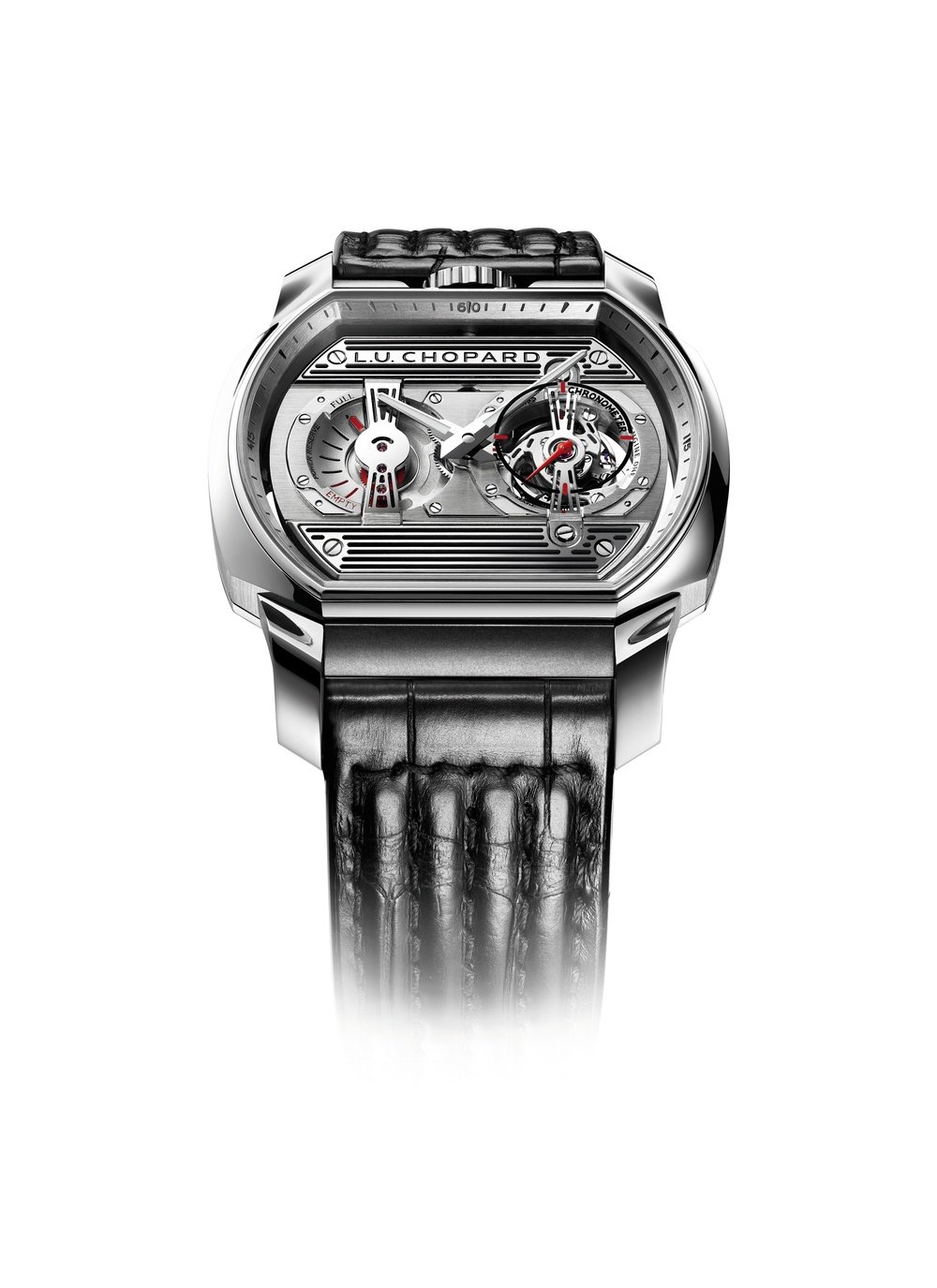 Technically complex, distinguished and sporting, the L.U.C Engine One H is a stunning visual hybrid of automotive mechanics and fine watchmaking. The proprietary tourbillon movement, which takes its finish from car engines, maintains a steady 480 revs per minute or 28,800 vibrations per hour. The barrel fills the tank with a full 60 hours of power reserve. The horizontal grooves in the bridges on the dial side take their cue from cylinder heads. Hours and minutes are centrally displayed whereas power reserve is shown on the left, on an indicator that reads like a fuel gauge. On the right, small seconds are mounted on the tourbillon, like a rev counter. The five rows of top-stitching on the alligator strap have the look and feel of 1960s and 70s car upholstery. The L.U.C Engine One H delivers further proof of Chopard’s dedication to car racing and its values of enjoyment and performance. Produced as a 100-piece limited series.