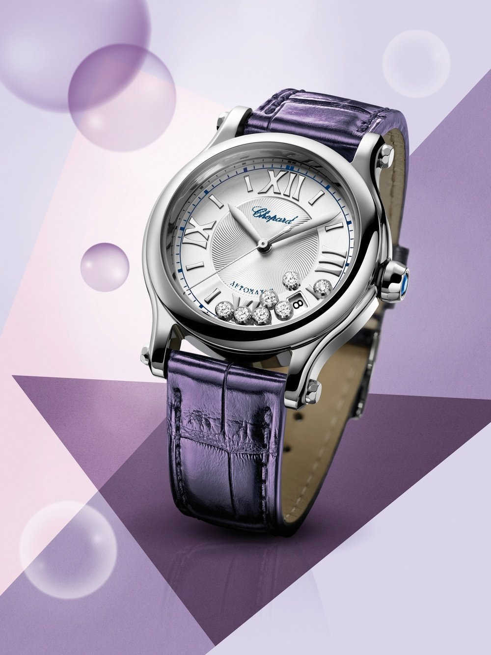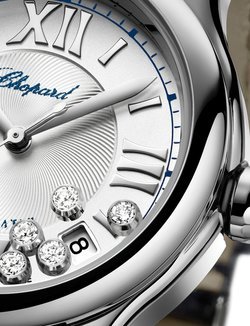 In 1993, Caroline Scheufele created what would become one of Chopard’s iconic timepieces, the Happy Sport. In 2013, to celebrate the anniversary of these freely moving diamonds that hover above exquisite dials, Chopard unveils the new Happy Sport Medium Automatic and at the same time adds a mechanical movement to the collection. This new interpretation has all the elegance and sophistication of the original Happy Sport. The silver-toned dial is embellished with a classic guilloché motif and wonderfully accentuates the sparkle of the seven moving diamonds. Turn it over, and the sapphire crystal back reveals the automatic mechanical movement with its straight-line “Côtes de Genève” motif. The 36mm steel case is set on an alligator strap.