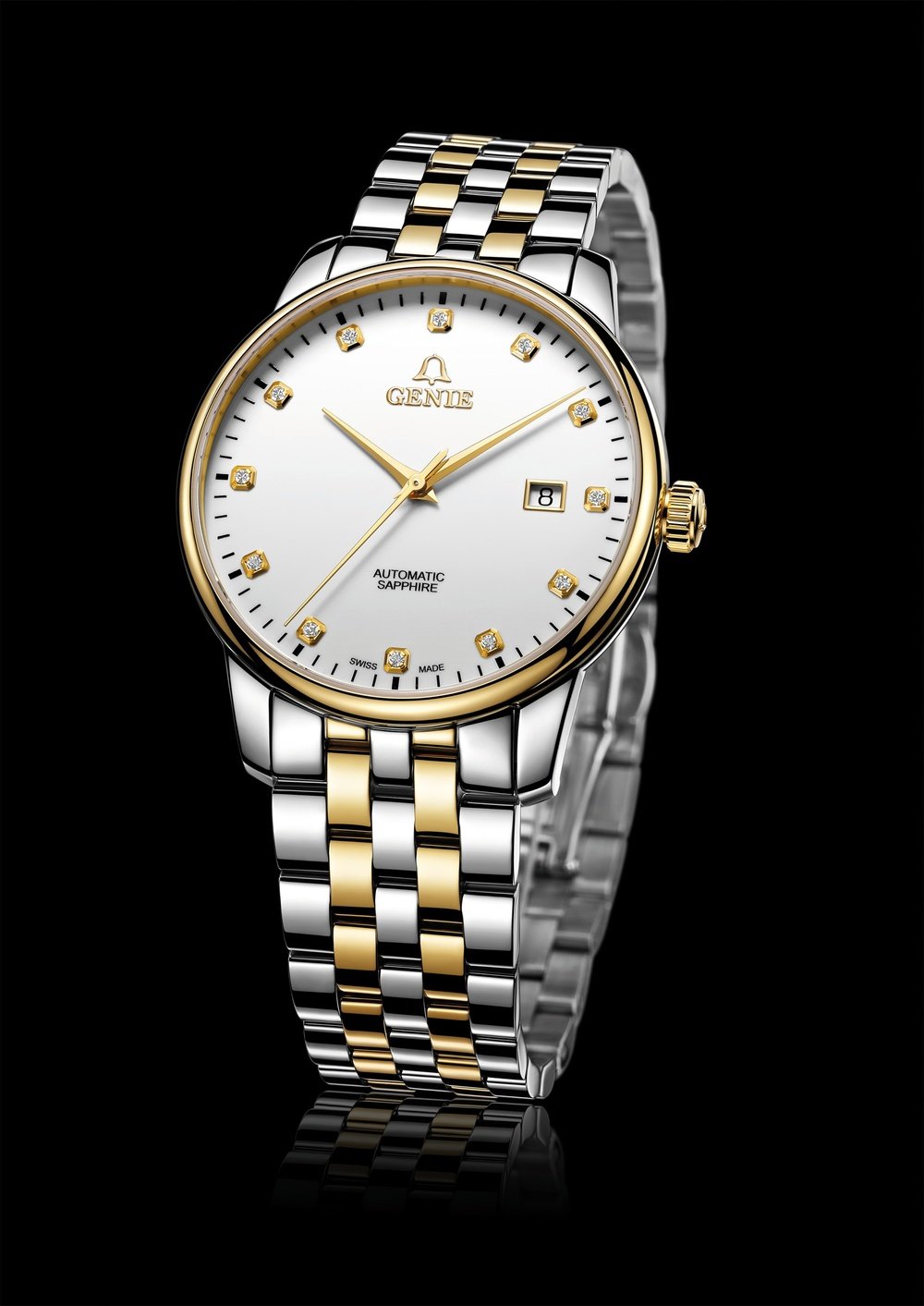 Established in 1919, Genie never tires of giving new faces to time. Its latest model is dedicated to the Chinese actress, and brand ambassador, Li Xiaoran. Sobriety prevails in this three hands and date timepiece. The gold-tinted hands and yellow gold-plated bezel are echoed in the complementary colours of the bracelet. Twelve diamonds accentuate the applied hour-markers. However, the true personality of this watch is revealed by its screw-down back. A cutaway detail at 12 o’clock offers a glimpse of the automatic movement and, just below, Li Xiaoran has signed her name, transforming this watch into a collector’s item for the star’s fans. With many more surprises to come, this is a partnership destined for greatness.