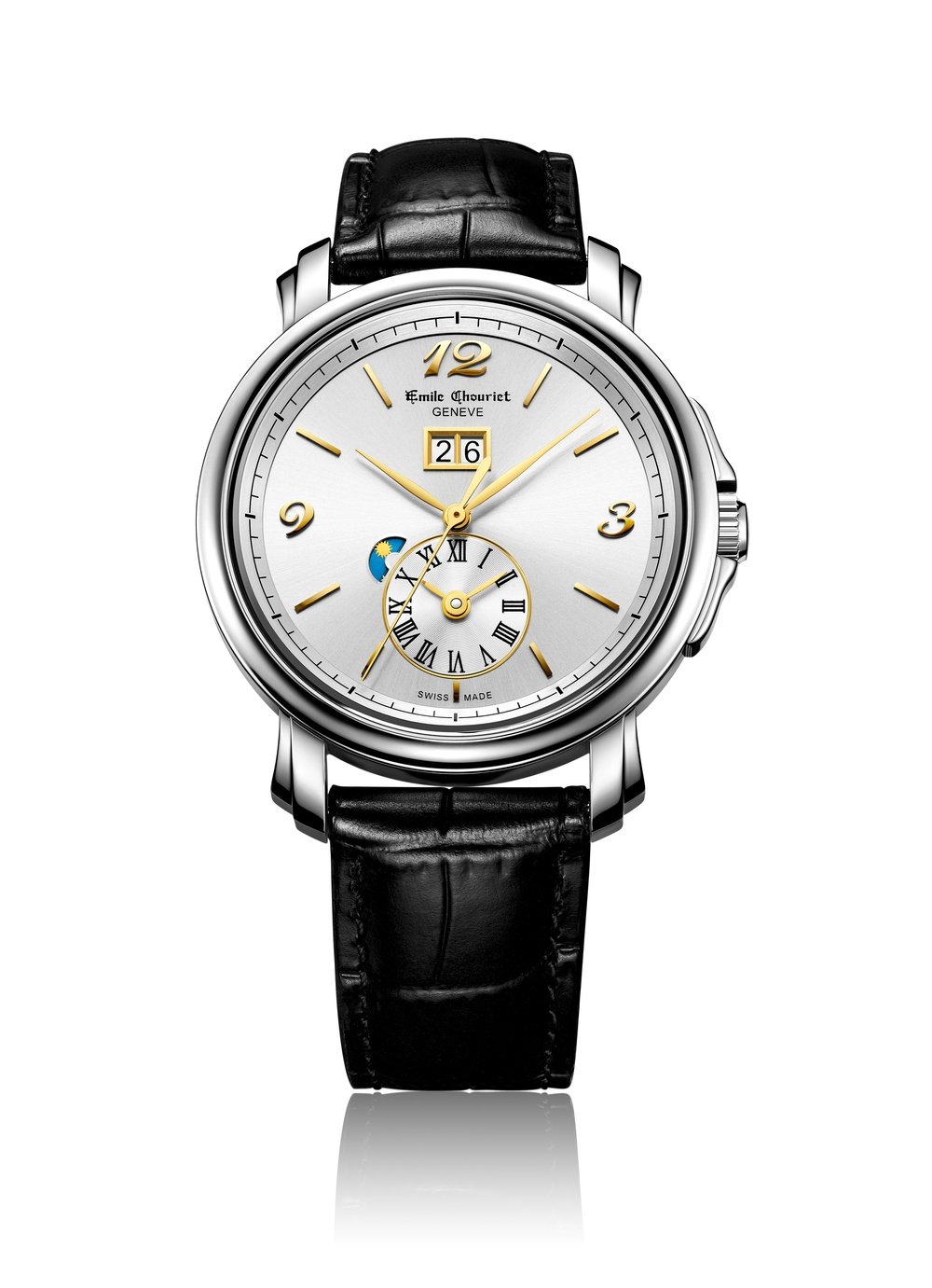Emile Chouriet returns to its Lac Léman collection. The three hands and date of the original make way for a series of three timepieces with Chronograph, Calendar or Dual Time complications. The watchmaker has taken care to conserve the pared-down elegance and Riviera chic of a collection that gives pride of place to Geneva and its lake. The Dual Time model features a large date window at 12 o’clock and, at 6 o’clock, a second time zone showing hours and minutes, in addition to a day/night indication. The steel case has the collection’s characteristic roundness and the uniquely shaped lugs.