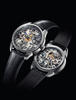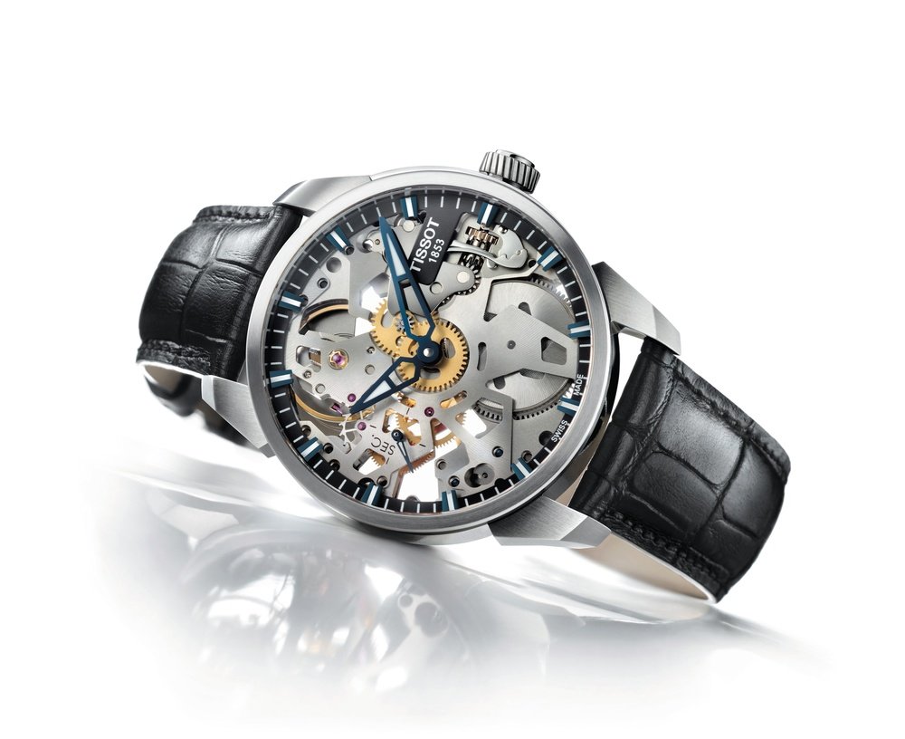 Tissot reveals the inner workings of its expertise with the Tissot T-Complication Squelette. The five “arms” that radiate under the sapphire crystal offer a plunging view of the hand-wound, mechanical skeleton movement. Elegant touches of dark blue, echoing the screws in the movement, transform the time display into a visual delight. Even the small seconds subdial has been engraved to preserve this absolute transparency. The slanted grooves around the crown, the scintillating jewels, and the lugs whose form echoes that of the “arms” confirm the uncompromising attention to detail that defines the Tissot T-Complication Squelette.