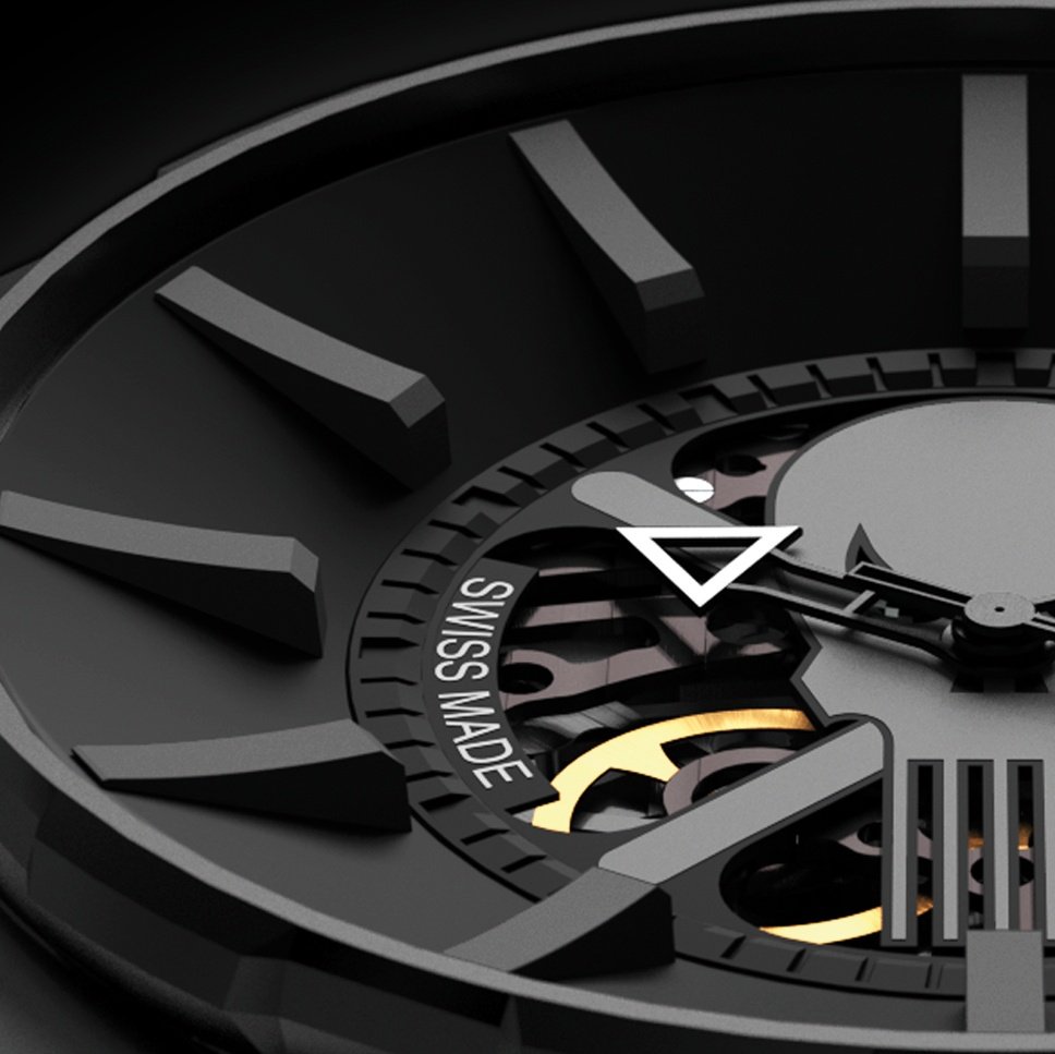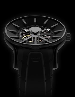 Phantoms are on the prowl in this especially original collection. The central skull-shaped applique stands out all the more distinctly thanks to its luminescent coating. It glows in the dark, reminding the wearer of the transient nature of life. The model remains loyal to its customary codes: the case is immediately recognisable, as are the three-dimensional hour-markers on the inner bezel ring. This full-black model is powered by a mechanical automatic movement.
