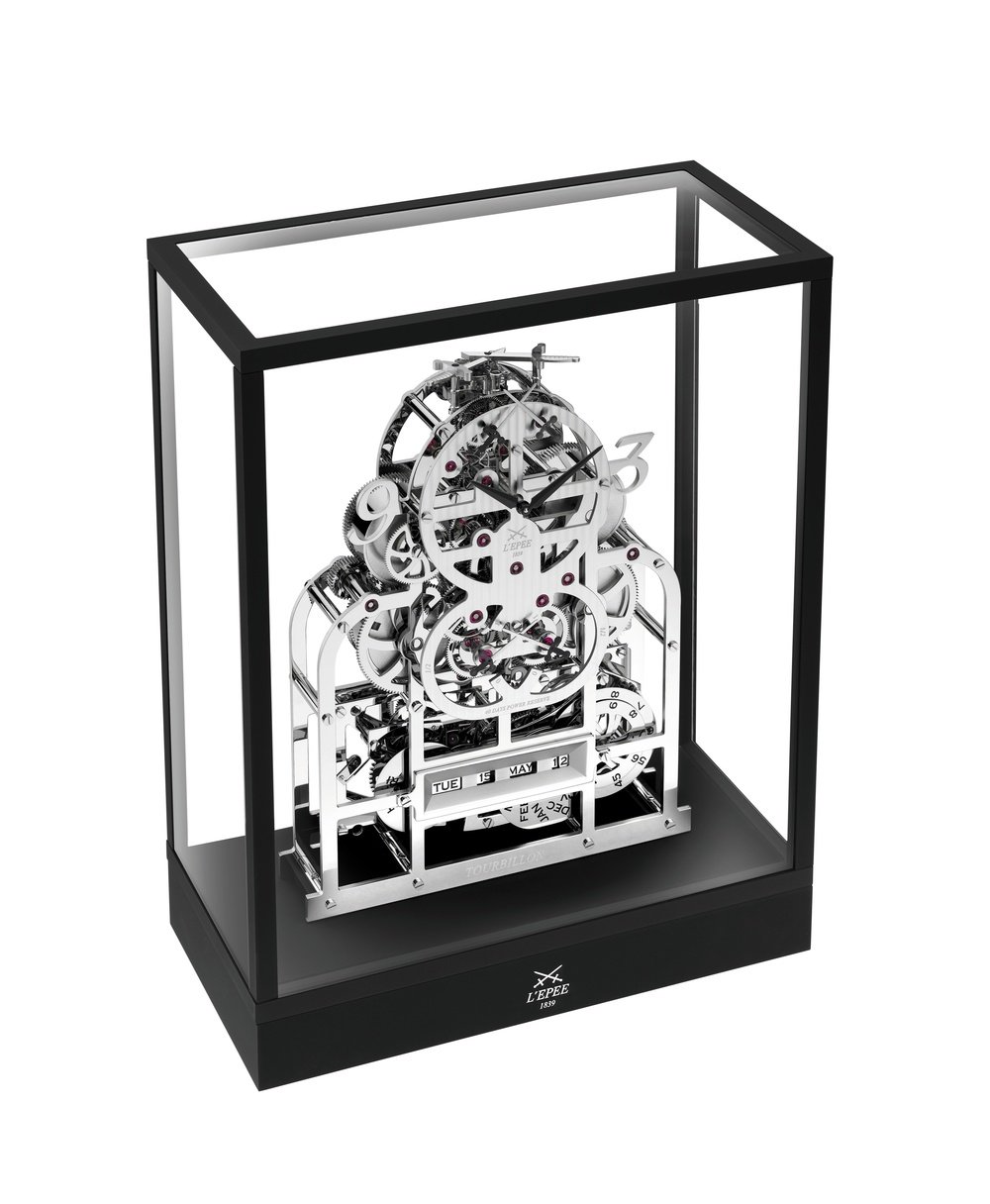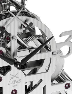 L’Epée isn’t afraid to cross swords with a challenge, particularly when pitted against the most complex mechanics. And so the Duel Perpétuel clock, already a feat of technique revealed in 2012, now incorporates a Tourbillon. This time, three sets of swords are en garde. The power reserve is still shown by two swords crossing then surrendering. A second duel takes place at 12 o’clock with the fabulous spectacle of two swords clashing every 20 seconds. Surmounting the mechanism, the Tourbillon makes its rotations under the close guard of two immobile swords. Three jumping discs at the base of the clock show the day, date, month and year. An 88-piece limited series that continues a horological tradition that began in 1839.