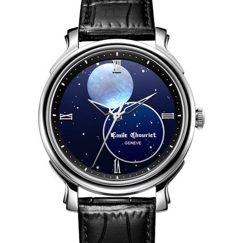 Emile Chouriet only has eyes for the moon, whose movements dominate the dial of its Moonphase watch. The Geneva brand has called on its talented watchmakers to develop an original calibre that has the moon rotate all the way round the dial. The decoration of the dial benefits from similar attention in the exceptional and innovative rendering of its materials. Blue mother-of-pearl creates a lifelike, shimmering moon, while metallic stars are dotted across its night “sky” to further illuminate this most realistic of backgrounds.