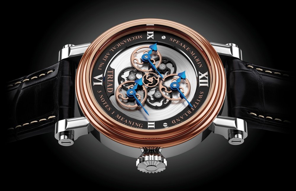 Triad celebrates three, a number of great symbolic significance. For the Chinese, three is the perfect number. There are three primary colours, red, blue and yellow. In numerology, three symbolises growth. In music it signifies the perfect harmony of the three-note chord. Such symbolism has fired the imagination of Peter Speake-Marin, the most Swiss of English watchmakers, inspiring the creation of the Triad watch. This is a timepiece like no other. Its silver dial displays three sets of synchronised hour and minute hands. This precisely coordinated choreography of six blued steel hands is governed by a gold wheel that rotates in 60 seconds. The automatic mechanical movement is housed inside Speake-Marin’s signature Piccadilly case. An 88-piece limited series.