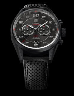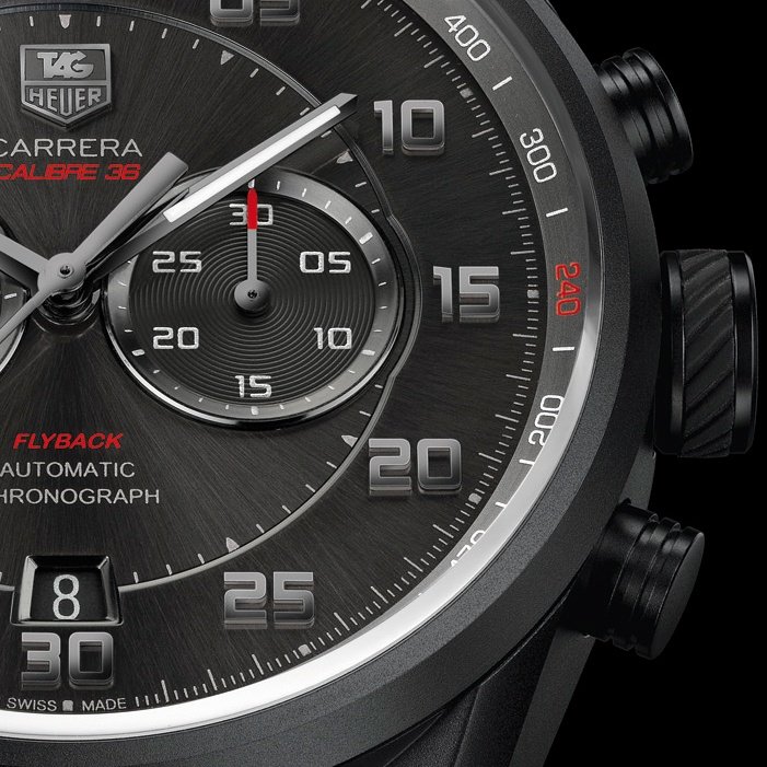 Tag Heuer adds to its Carrera collection with a stylish sports watch driven by the proprietary Calibre 36, thus named for its 36,000 vib/hour frequency. This elegant chronograph has the distinction of a flyback function, a complication inspired by car racing but of equal use to pilots, for instantaneously resetting and restarting the chrono hand. The generous 43 mm case, made from grade 2 titanium, stands out for its black carbide coating and sanded finish. The anthracite dial boasts the signature sunbrushed finish while the hour-markers and different hands are in black gold. The snailing on the 30-minute counter and small seconds testifies to the importance TAG Heuer affords to detail. The perforated black strap takes its cue from racing-car steering wheels, an environment that runs through the design and values of this new timepiece from TAG.