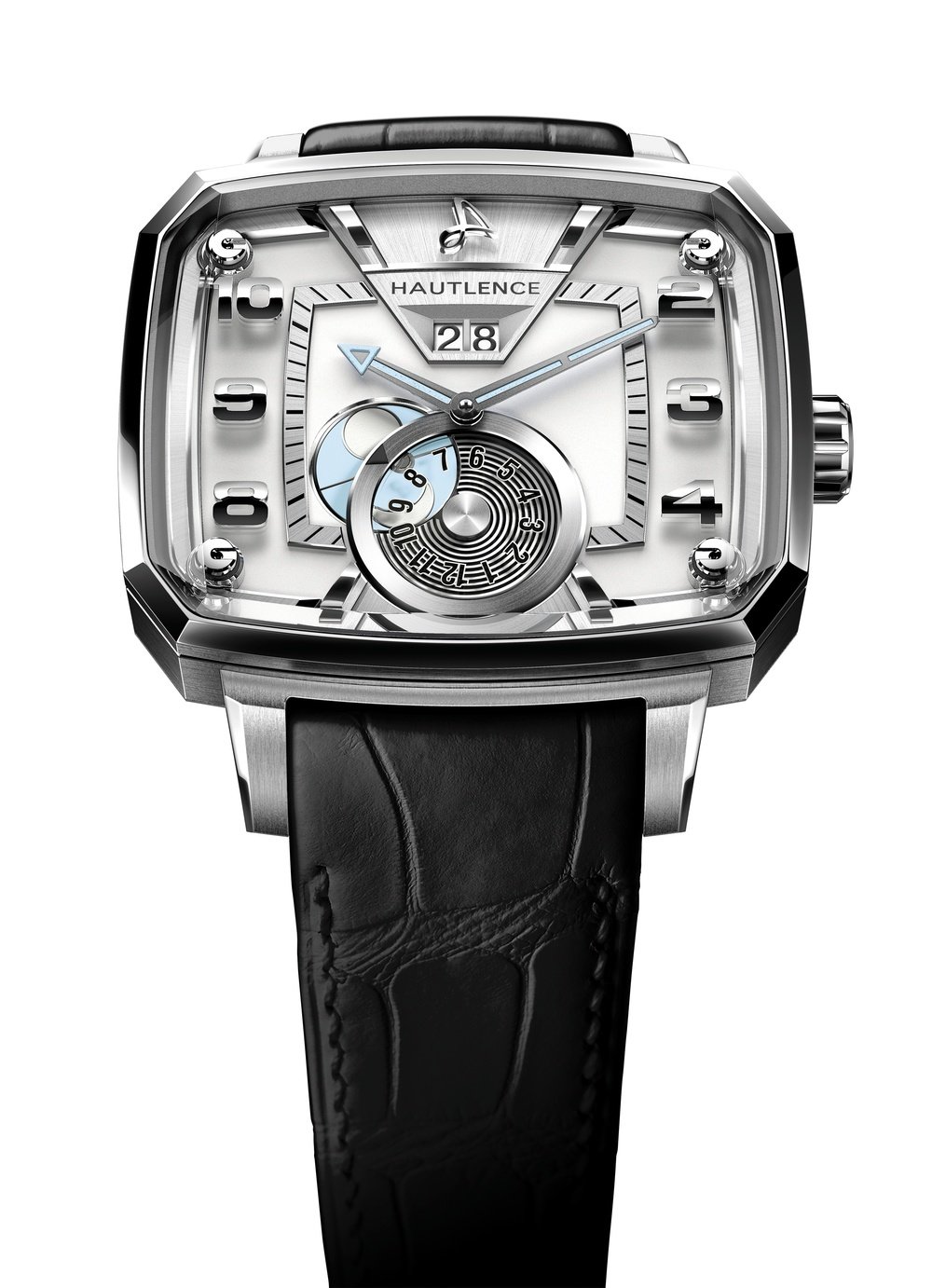 Sapphire intermediate dial with applied hours, hour-markers and logo HAUTLENCE engraved on the large date bridge