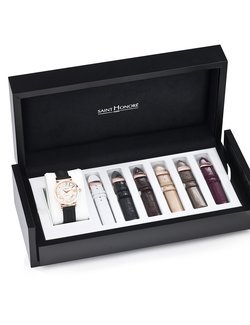 Set delivered with 7 interchangeable straps: beige and purple varnished leather, black and white rubber leather or black, white or brown leather strap