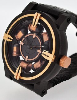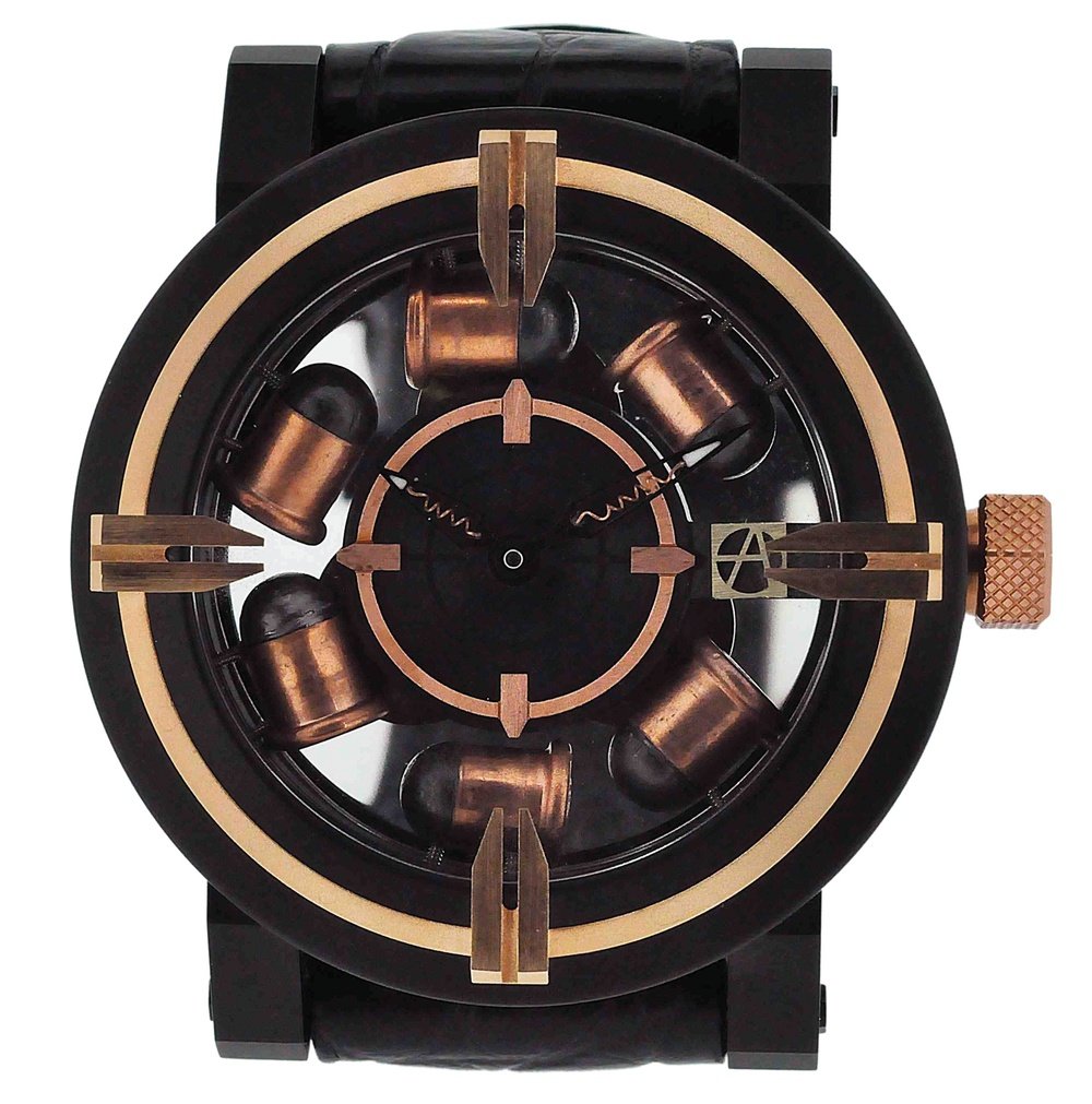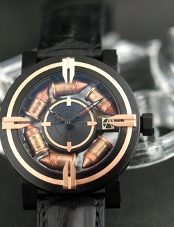 The Maya calendar predicted the end of the world in 2012, the same year the ArtyA brand presented its Son of a Gun timepiece. The real bullets it contained were a huge hit. A best-seller for what was to become a collection in its own right, comprising unique pieces and limited series. This year, Flobert 6-mm bullets seem to be floating between the black and copper colours, a highly stylised way of recalling the Son of a Gun motto: Remember to live and to be happy because you see the time but you do not know yours.