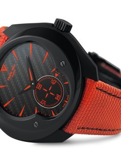 Automatic mechanical movement. DHES steel case. Hours, minutes, seconds. Carbon fibre dial with