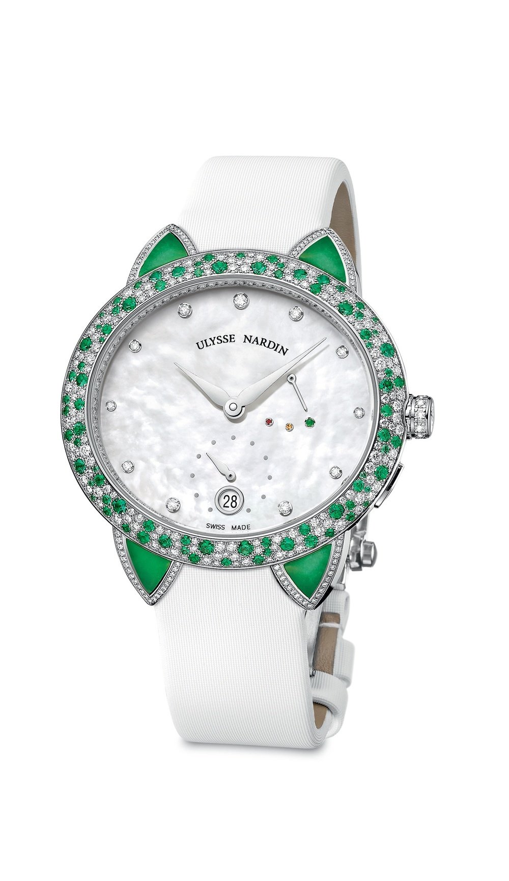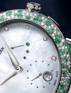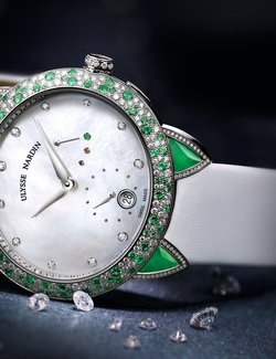 Manufacture Ulysse Nardin has imagined this mechanical movement especially for women. In a delicious setting of mother-of-pearl, diamonds, emeralds and green jade, the movement is made to facilitate setting the time, the date, and winding by the crown without the risk of chipping a nail.