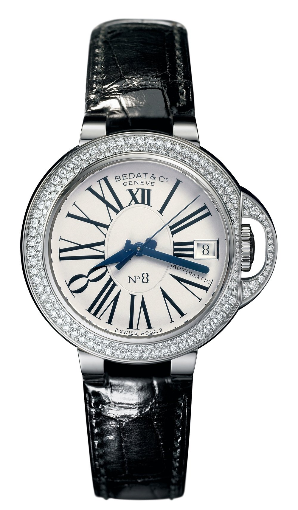 The delightfully feminine Reference 828 is both fascinating and seductive with its delicate curves and its iconic crown guard sparkling with gems to echo the diamond-set bezel. Large Roman numerals stand out against the dial, while the BEDAT & Co GENEVE logo appears at 8 o’clock proclaiming its origin and its kinship with the ultimate lucky number.