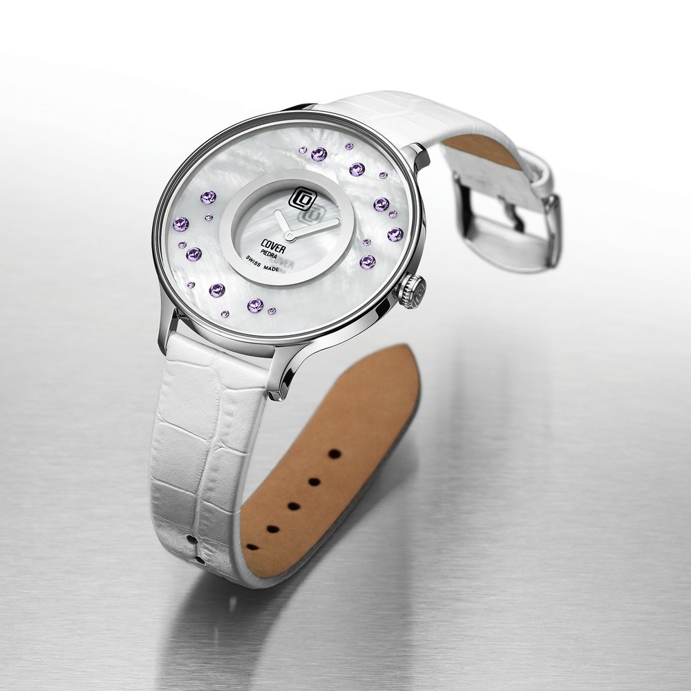 SWAROVSKI ELEMENTS scattered across a precious mother-of-pearl dial glisten like tiny stars in a midnight sky. This fascinating composition is delicately framed by an elegant round case. Completing the whole, a slender leather strap encircles the wrist to bring the perfect finishing touch to this truly feminine watch. Proposed in 3 different colours.