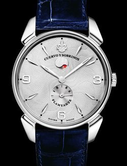 True to its philosophy to build on the past to invent the future, Cuervo y Sobrinos has looked to one of its iconic watches from the 1950s as the setting for an extra-thin calibre with the innovative addition of a power-reserve disc which only appears when power is running low. Deliciously vintage with its characteristic 1950s “flamboyant” guilloché, hence its name, this timepiece demonstrates, with enviable style, the impressive expertise which this most Latin of Swiss brands has acquired over its 132-year history.