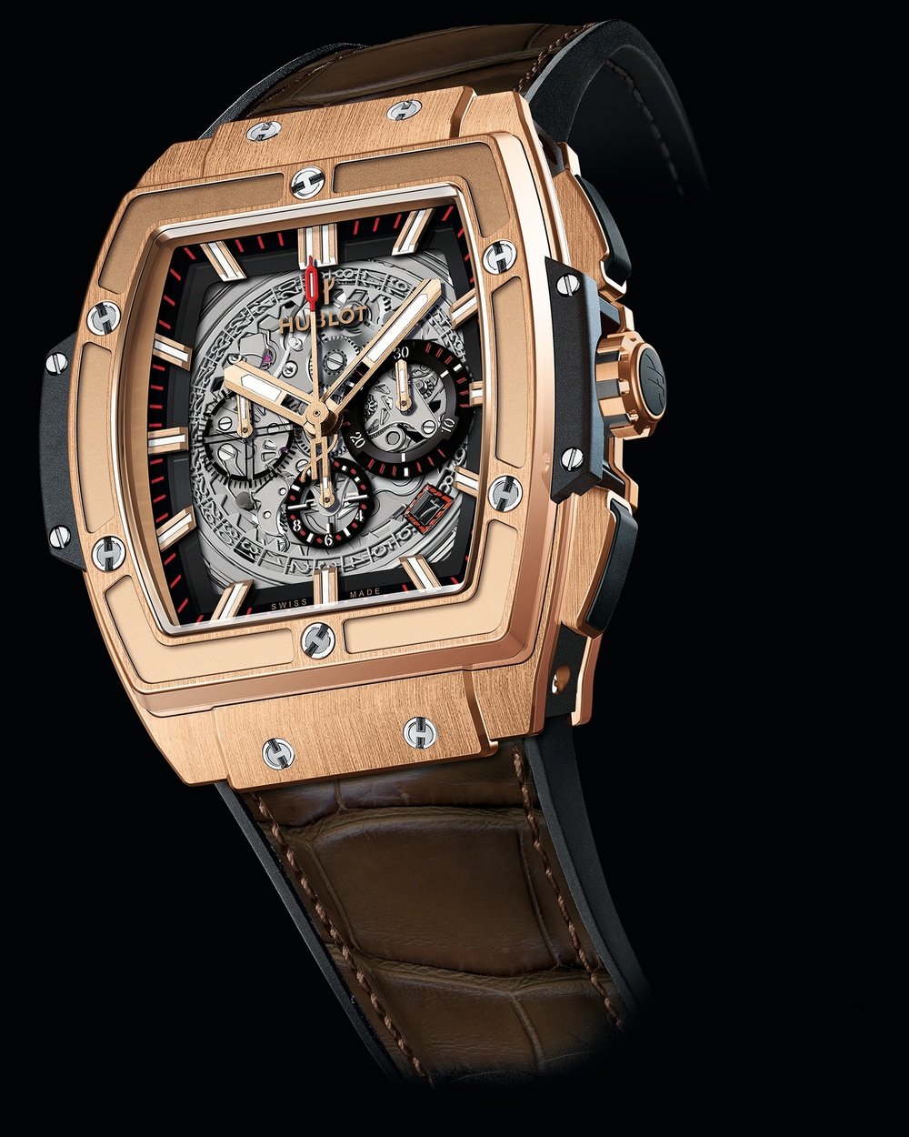 A tonneau case puts a new spin on the Big Bang for a watch that is pure Hublot, but in a different form. The case’s ingenious sandwich construction paves the way for innumerable combinations of materials and colours, while the case middle’s satin-finished sides and micro-blasting create a unique style in the world of Big Bang. Inside this sophisticated exterior beats a high-frequency, skeleton chronograph movement – also new. Superlative mechanics, powerful lines, fusion of materials: the spirit of Big Bang strikes again!