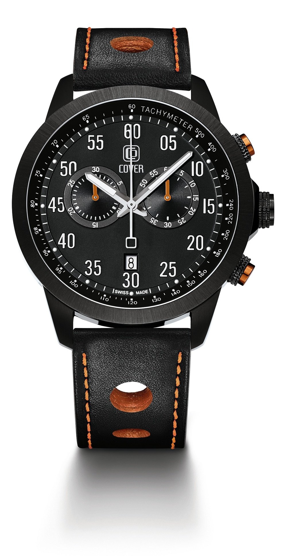 A modern, sports style materialised in a perfectly proportioned case. Graphic lines, a tachymeter to measure speed, the instant legibility of white numerals against all-over black, with accents in red or orange aluminium for a splash of colour. Masculine through and through, this new chronograph is made to measure for life in the fast lane.