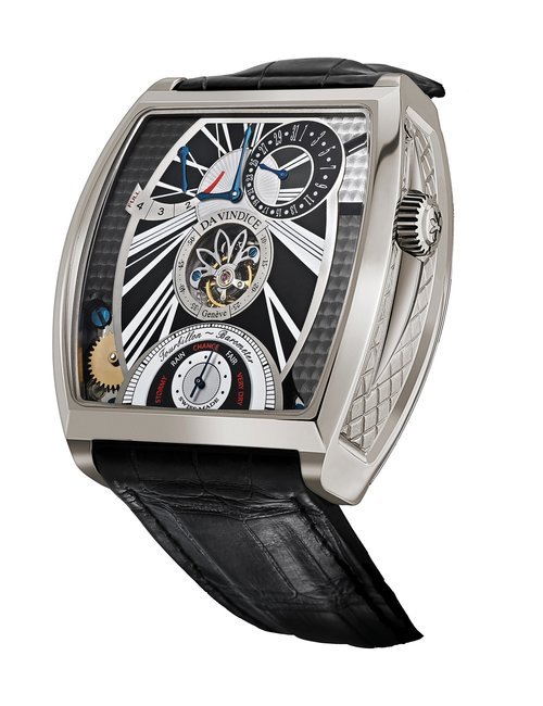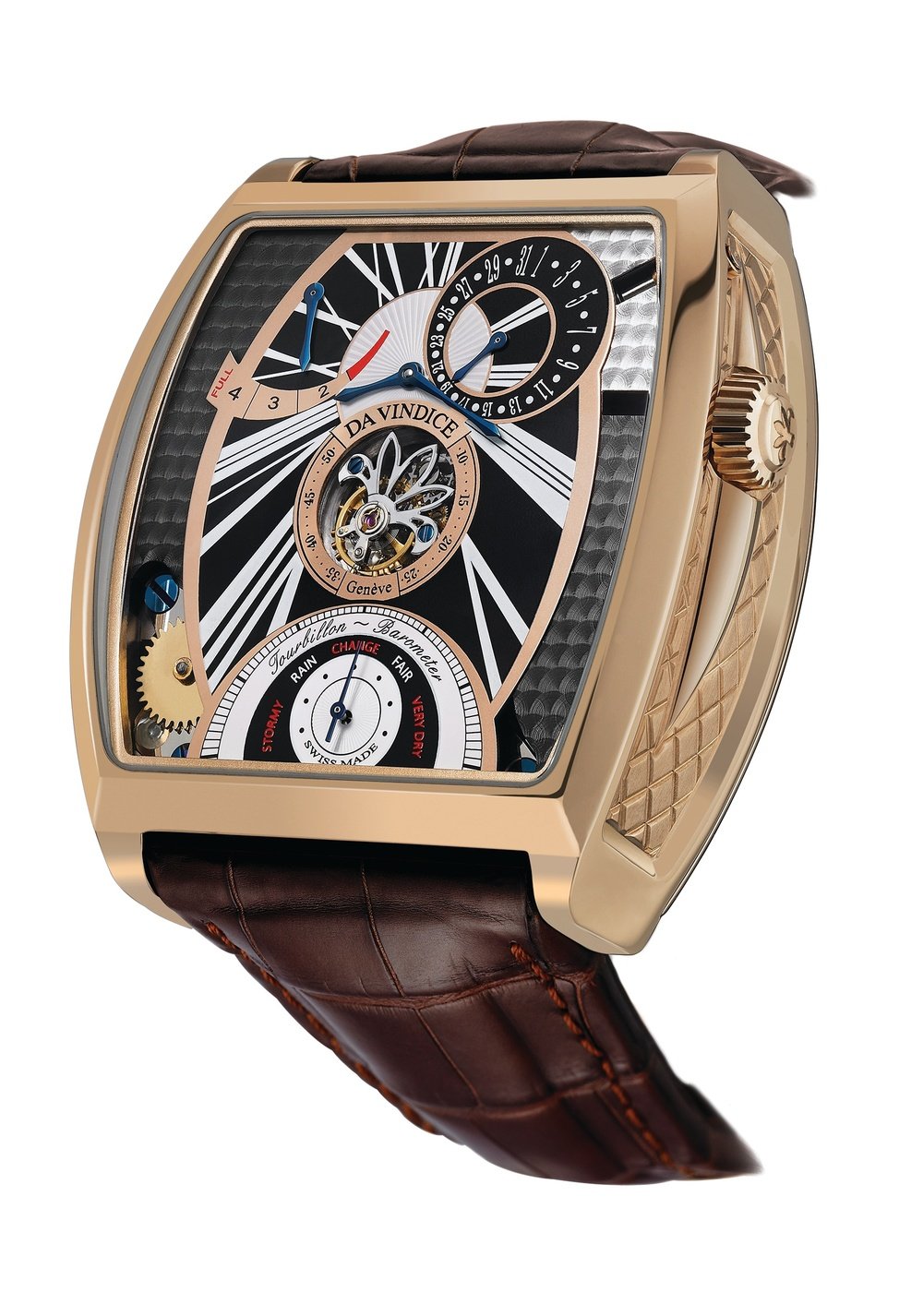 Da Vindice introduces an authentic feat combining a barometer and a tourbillon within a watch mechanism. The hermetically sealed capsule with a partial vacuum is influenced by variations in atmospheric pressure. Its movements are mechanically expressed through indications appearing at 6 o’clock on the dial. The tourbillon topped with a fleur de lys, the brand emblem, spins airily at the centre of this fascinating model, while the small seconds appear around the rim of its carriage.