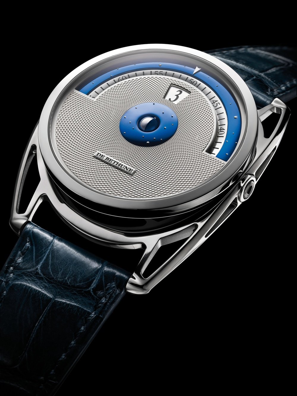 For De Bethune, late eighteenth-century fine watchmaking is an inspiration from which the future can be drawn. The Manufacture delivers its highly contemporary vision of this period’s aesthetic in the new DB28 Digitale, whose hand-guilloché dial is the backdrop for three types of display: spherical for moon phases, digital for jumping hours, and analogue for minutes on a rotating disc. Visual balance is achieved by the patented spherical moon in the centre of the dial. Its two polished hemispheres, one in palladium, the other in flame-blued steel, show the moon’s phases with a precision of one lunar day every 1,112 years. The case, which is crafted from mirror-polished titanium, benefits from a patented system of spring-mounted floating lugs for millimetric adjustment to the wrist and its movements.