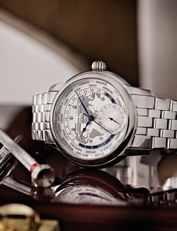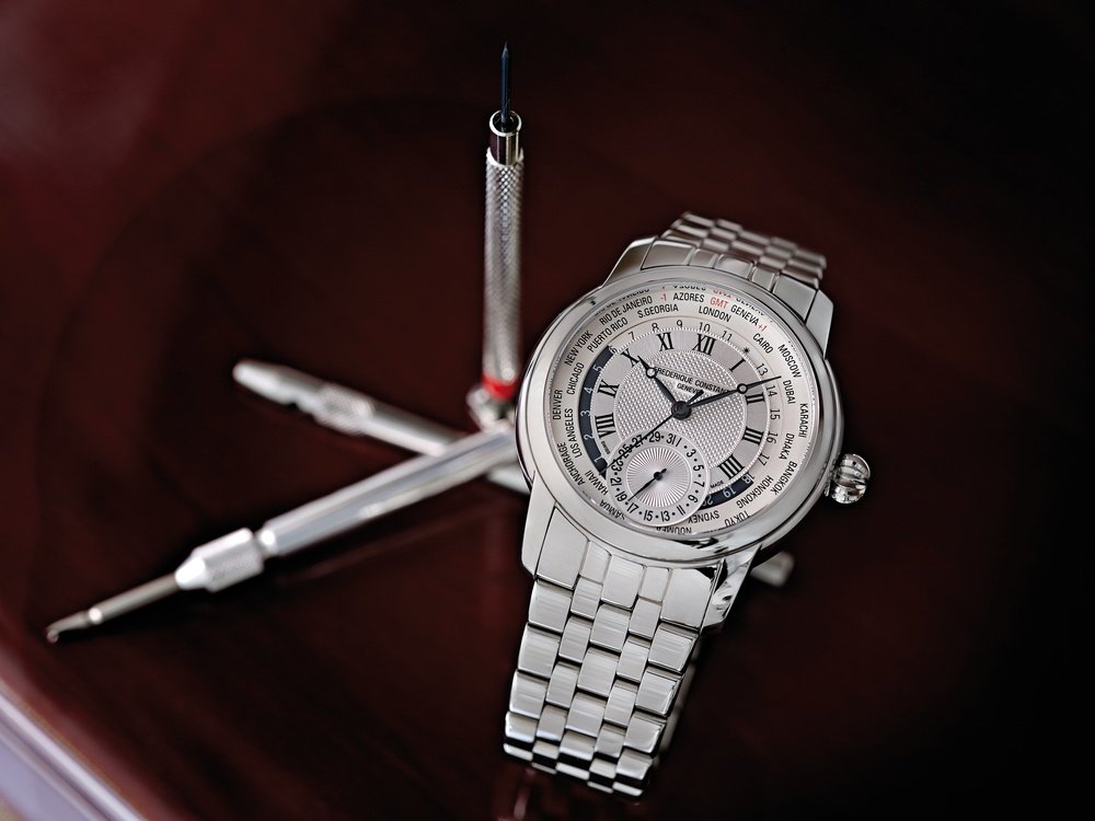 The companion to long-distance travellers, the Classics Manufacture Worldtimer is driven by one of the most complex movements ever made by Frederique Constant: the FC-718 calibre. Yet the true genius of this watch is its simplicity of use, with all the functions commanded by the crown. The wearer can read, at a glance, time in 24 major world cities simultaneously around the dial. And so as never to lose track with home as he criss-crosses the globe, the 24-hour disc includes a day/night indicator. The date, meanwhile, can be read from the elegant counter that is swept by a hand at 6 o’clock.