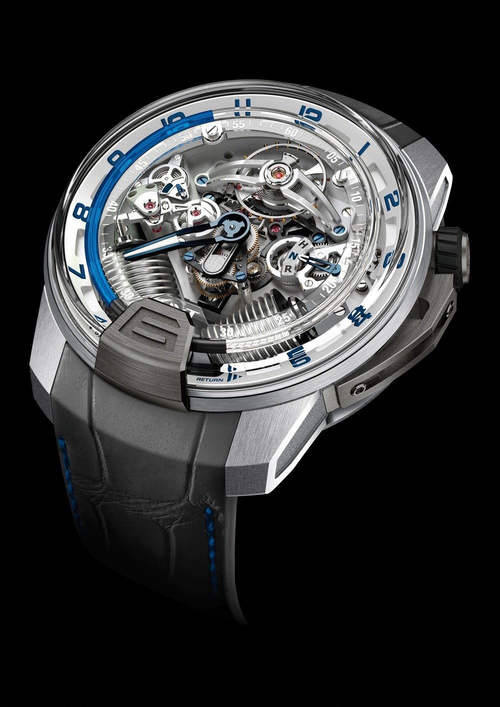 HYT continues its quest for hybridisation, this time with a blue liquid that interacts with the mechanical movement through an interface of two bellows in a “V” arrangement. The central minute hand has a layered construction to run alongside the fluid system and sweep the bellows by making a jump after 30 minutes. The crown-position indicator (“H-N-R”) at 3 o’clock is balanced by another hand corresponding to a temperature indicator. This exclusive HYT innovation tells the wearer when the liquid is at the optimal temperature to adjust the watch. Limited series of 20.