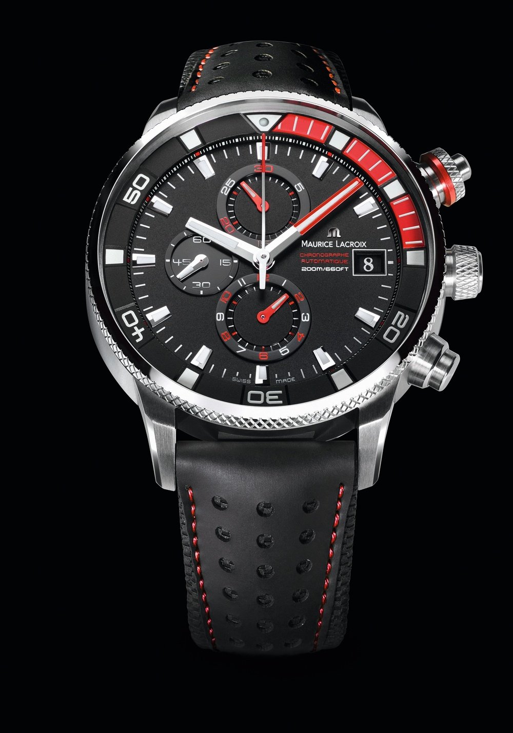 A super-powerful engine and equally forceful bodywork. Performance and style guaranteed to set the pulse of thrill-seekers racing. Such are the principles governing this new Pontos S Supercharged from Maurice Lacroix, propelled by the personalised automatic ETA Valgranges movement. While this authentic mechanical performance-accelerator is known for its reliability and its precision, it is also one of the biggest horological ‘motors’ on the market, enabling optimal layout of the chronograph counters to ensure perfect readability. The generous case with its adrenaline-charged lines does the rest.